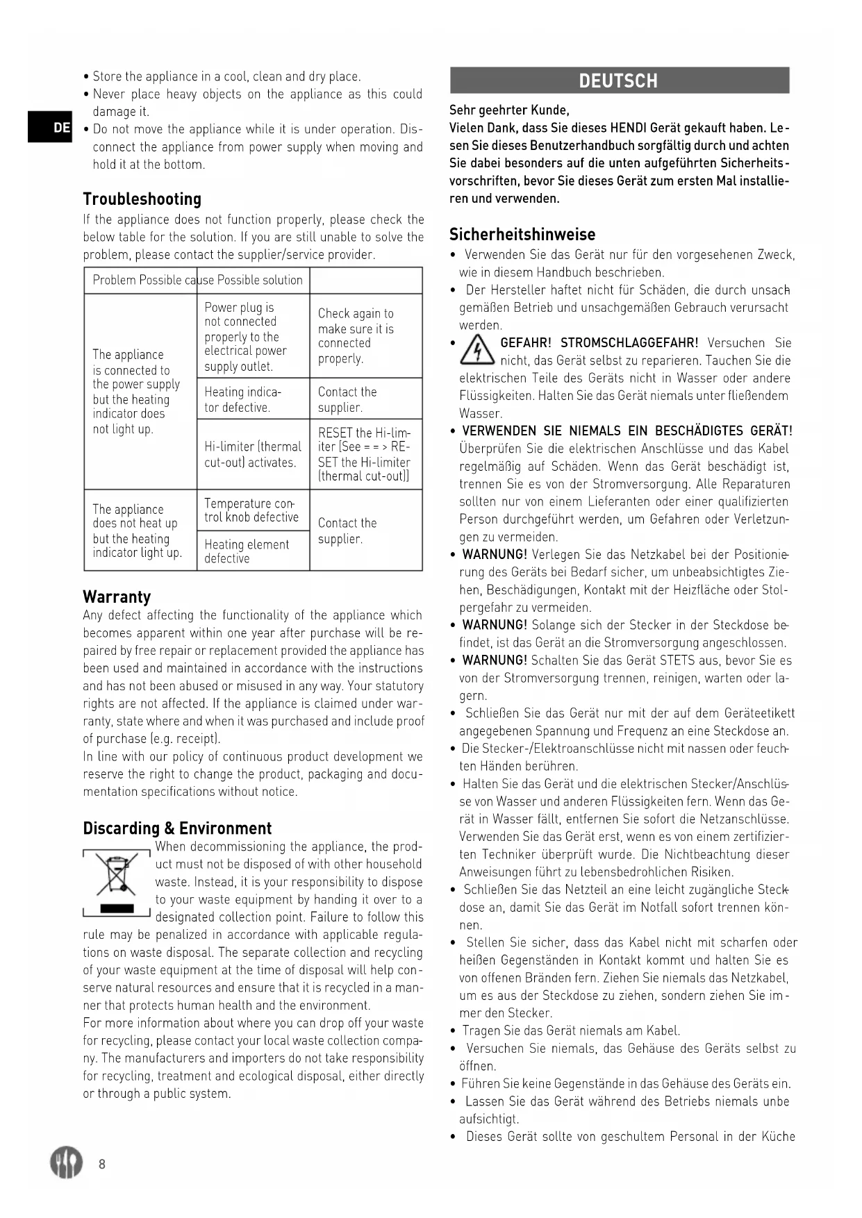 lerknopf defekt Wenden Sie sich an den Lieferanten. Heizelement defekt Garantie Defekte, die die Funktionsfähigkeit des Geräts beeinträchtigen und innerhalb eines Jahres nach dem Kauf sichtbar werden, werden durch kostenlose Reparatur oder Ersatz repariert, so