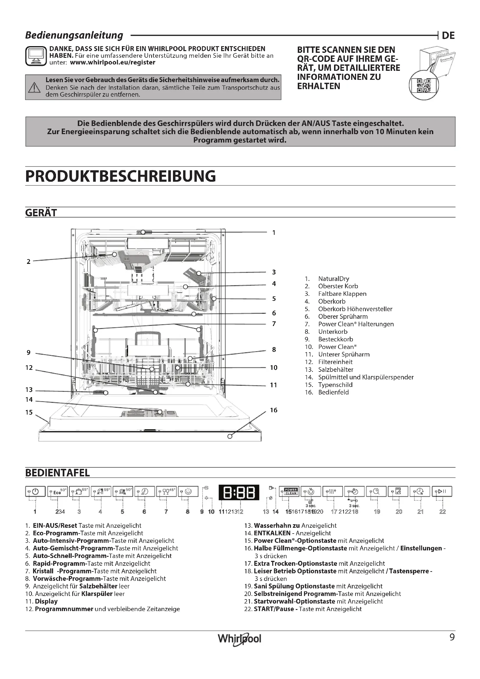 DANKE, DASS SIE SICH FÜR EIN WHIRLPOOL PRODUKT ENTSCHIEDEN HABEN. Für eine umfassendere Unterstützung melden Sie Ihr Gerät bitte an unter: www.whirlpool.eu/register1. EIN-AUS/Reset Taste mit Anzeigelicht2. Eco-Programm-Taste mit Anzeigelicht3. Auto-Intensiv-Programm-Taste mit Anzeigelicht4. Auto-Gemischt-Programm-Taste mit Anzeigelicht5. Auto-Schnell-Programm-Taste mit Anzeigelicht 6. Rapid-Programm-Taste mit Anzeigelicht7. Kristall-Programm-Taste mit Anzeigelicht8. Vorwäsche-Programm-Taste mit Anzeigelicht9. Anzeigelicht für Salzbehälter leer10. Anzeigelicht für Klarspüler leer11. Display12. Programmnummer und verbleibende Zeitanzeige13. Wasserhahn zu Anzeigelicht14. ENTKALKEN - Anzeigelicht15. Power Clean®-Optionstaste mit Anzeigelicht16. Halbe Füllmenge-Optionstaste mit Anzeigelicht / Einstellungen - 3s drücken17. Extra Trocken-Optionstaste mit Anzeigelicht18. Leiser Betrieb Optionstaste mit Anzeigelicht / Tastensperre - 3sdrücken19. Sani Spülung Optionstaste mit Anzeigelicht20. Selbstreinigend Programm-Taste mit Anzeigelicht21. Startvorwahl-Optionstaste mit Anzeigelicht22. START/Pause - Taste mit AnzeigelichtLesen Sie vor Gebrauch des Geräts die Sicherheitshinweise aufmerksam durch. Denken Sie nach der Installation daran, sämtliche Teile zum Transportschutz aus dem Geschirrspüler zu entfernen.