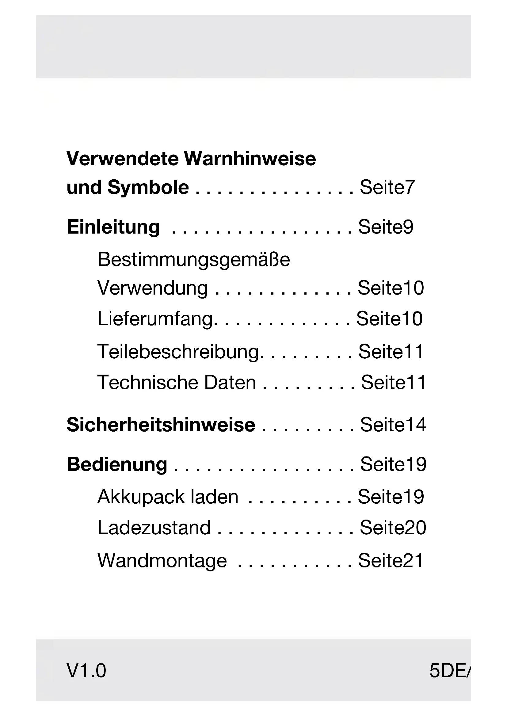 B5DE/AT/CH Verwendete Warnhinweise und Symbole ............... Seite 7 Einleitung ................. Seite 9 Bestimmungsgemäße Verwendung ............. Seite 10 Lieferumfang............. Seite 10 Teilebeschreibung......... Seite 11 Technische Daten ......... Seite 11 Sicherheitshinweise ......... Seite 14 Bedienung ................. Seite 19 Akkupack laden .......... Seite 19 Ladezustand ............. Seite 20 Wandmontage ........... Seite 21 V 1.06 DE/AT/CH Reinigung und Pege........ Seite 23 Entsorgung ................ Seite 24 Vereinfachte EU- Konformitätserklärung....... Seite 28 Garantie................... Seite 29 Abwicklung im Garantiefall .. Seite 30 Service ................. Seite 347DE/AT/CH Verwendete Warnhinweise und Symbole In dieser Bedienungsanleitung, auf der Verpackung und auf dem Typenschild werden die folgenden Warnhinweise verwendet: Lesen Sie die Bedienungsanleitung. Warn- und Sicherheitshinweise beachten! Wechselstrom/-spannung8 DE/AT/CH Gleichstrom/-spannung Schutzklasse II (Doppelisolierung) Verwenden Sie das Produkt nur in trockenen Innenräumen. T3.15A Sicherung Dieses Symbol mit dem Signalwort „Info“ bietet weitere nützliche Informationen.9DE/AT/CH Sicherheitshinweise und zusätzliche Informationen Handlungsanweisungen