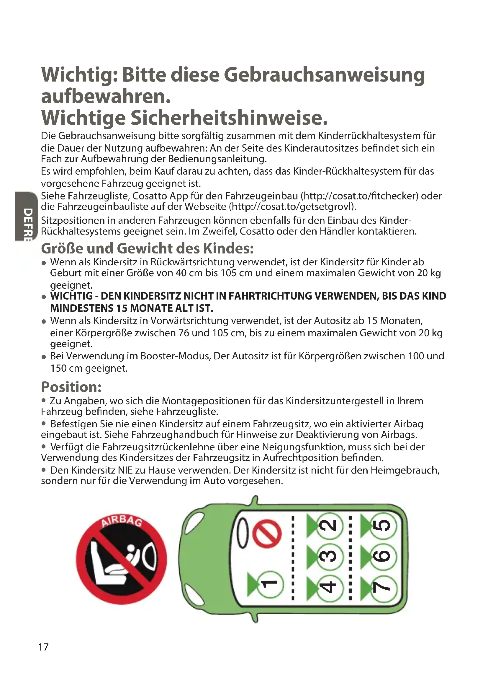 - HINWEIS: Der Kindersitz kann auf dem Fahrzeugsitzpolster Abdrücke hinterlassen. Cosatto haftet nicht für Schäden oder Abdrücke auf dem dem Fahrzeugsitzpolster.