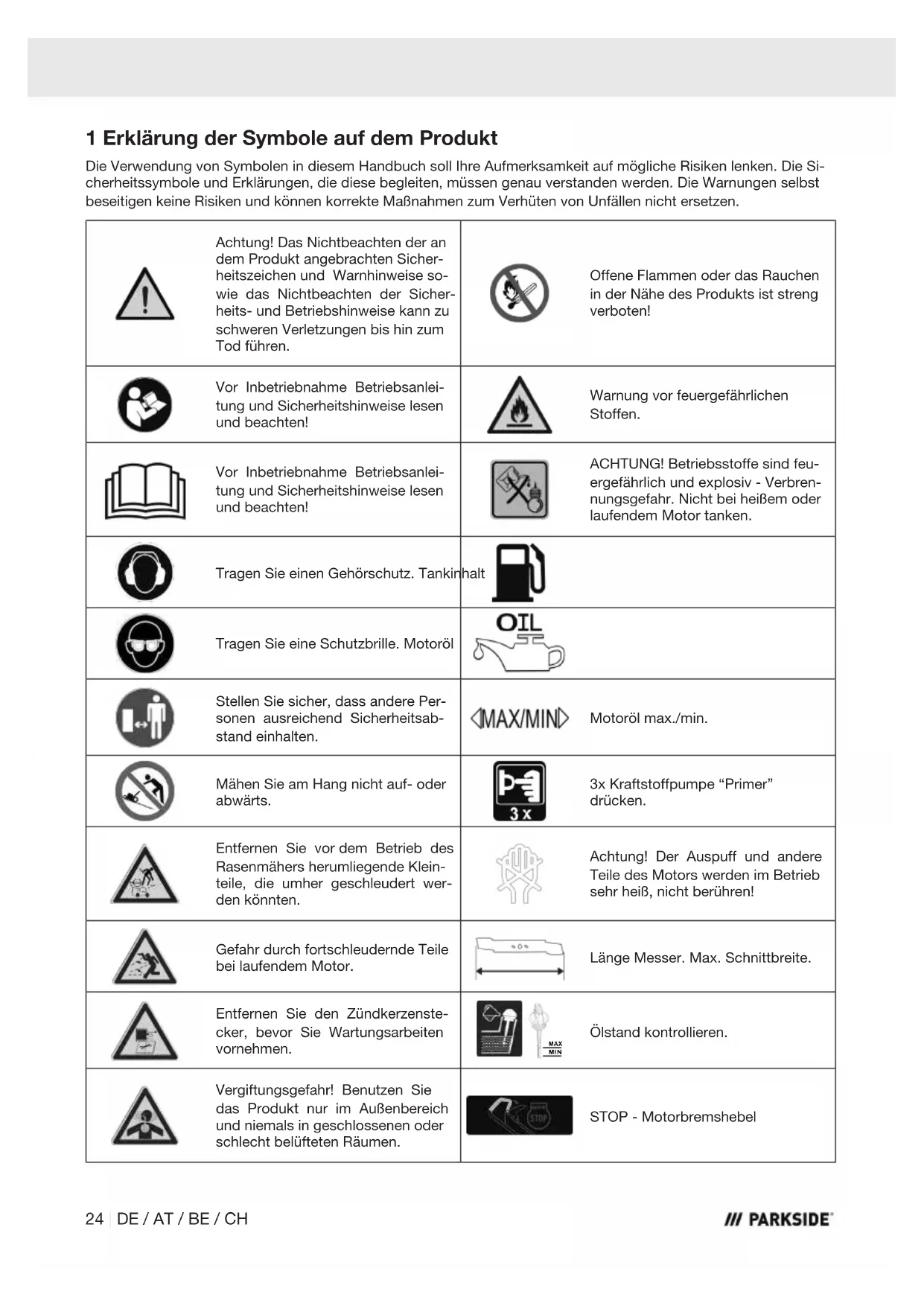 - You can view and download these and many other manuals at parkside-diy.com. This QR code will take you directly to parkside-diy.com. Select your country and use the search mask to search for the operating instructions. Enter the article number (IAN) 508992_2507 to ac- cess the operating instructions for your article. GB / IE / NI / CY / MT | 21Service contact (GB): Service contact (IE): Name: Forest Park & Garden Coed Court, Taffsmead Road Treforest, Ind. Estate, Pontypridd CF375SW Name: Forest Park & Garden Coed Court, Taffsmead Road Treforest, Ind. Estate, Pontypridd CF375SW Tel: 00800 4003 4003 Tel: 00800 4003 4003 E-Mail: service.GB@scheppach.com E-Mail: service.IE@scheppach.com Location: Great Britain Location: Great Britain Service contact (NI): Service contact (CY): Name: Forest Park & Garden Coed Court, Taffsmead Road Treforest, Ind. Estate, Pontypridd CF375SW Name: Netsend GmbH Nachtwaid 6 DE - 79206 Breisach am Rhein Tel: 00800 4003 4003 Tel: 00800 4003 4003 E-Mail: service.NI@scheppach.com E-Mail: service.CY@scheppach.com Location: Great Britain Location: Germany Service contact (IT): Name: Netsend GmbH Nachtwaid 6 DE - 79206 Breisach am Rhein Tel: 00800 4003 4003 E-Mail: service.IT@scheppach.com Location: Germany 22 | GB / IE / NI / CY / MTInhaltsverzeichnis 1 Erklärung der Symbole auf dem Produkt......................................................................................................... 24 2 Einleitung ......................................................................................................................................................... 26 3 Produktbeschreibung (Abb. 1-17).................................................................................................................... 26 4 Lieferumfang(Abb.1-2) ................................................................................................................................... 26 5 Bestimmungsgemäße Verwendung................................................................................................................. 26 6 Nicht bestimmungsgemäße Verwendung........................................................................................................ 27 7 Sicherheitshinweise ......................................................................................................................................... 27 8 Technische Daten ............................................................................................................................................ 31 9 Auspacken ....................................................................................................................................................... 31 10 Montage........................................................................................................................................................... 32 11 Vor Inbetriebnahme.......................................................................................................................................... 32 12 Betrieb.............................................................................................................................................................. 34 13 Arbeitshinweise................................................................................................................................................ 36 14 Reinigung und Wartung ................................................................................................................................... 37 15 Transport.......................................................................................................................................................... 40 16 Lagerung.......................................................................................................................................................... 40 17 Reparatur und Ersatzteilbestellung.................................................................................................................. 41 18 Entsorgung und Wiederverwertung ................................................................................................................. 42 19 Störungsabhilfe................................................................................................................................................ 42 20 EU-Konformitätserklärung ............................................................................................................................... 43 21 Garantieurkunde .............................................................................................................................................. 44 22 Explosionszeichnung ....................................................................................................................................... 249 DE / AT / BE / CH | 231 Erklärung der Symbole auf dem Produkt Die Verwendung von Symbolen in diesem Handbuch soll Ihre Aufmerksamkeit auf mögliche Risiken lenken. Die Si- cherheitssymbole und Erklärungen, die diese begleiten, müssen genau verstanden werden. Die Warnungen selbst beseitigen keine Risiken und können korrekte Maßnahmen zum Verhüten von Unfällen nicht ersetzen. Achtung! Das Nichtbeachten der an dem Produkt angebrachten Sicher- heitszeichen und Warnhinweise so- wie das Nichtbeachten der Sicher- heits- und Betriebshinweise kann zu schweren Verletzungen bis hin zum Tod führen. Offene Flammen oder das Rauchen in der Nähe des Produkts ist streng verboten! Vor Inbetriebnahme Betriebsanlei- tung und Sicherheitshinweise lesen und beachten! Warnung vor feuergefährlichen Stoffen. Vor Inbetriebnahme Betriebsanlei- tung und Sicherheitshinweise lesen und beachten! ACHTUNG! Betriebsstoffe sind feu- ergefährlich und explosiv - Verbren- nungsgefahr. Nicht bei heißem oder laufendem Motor tanken. Tragen Sie einen Gehörschutz. Tankinhalt Tragen Sie eine Schutzbrille. Motoröl Stellen Sie sicher, dass andere Per- sonen ausreichend S