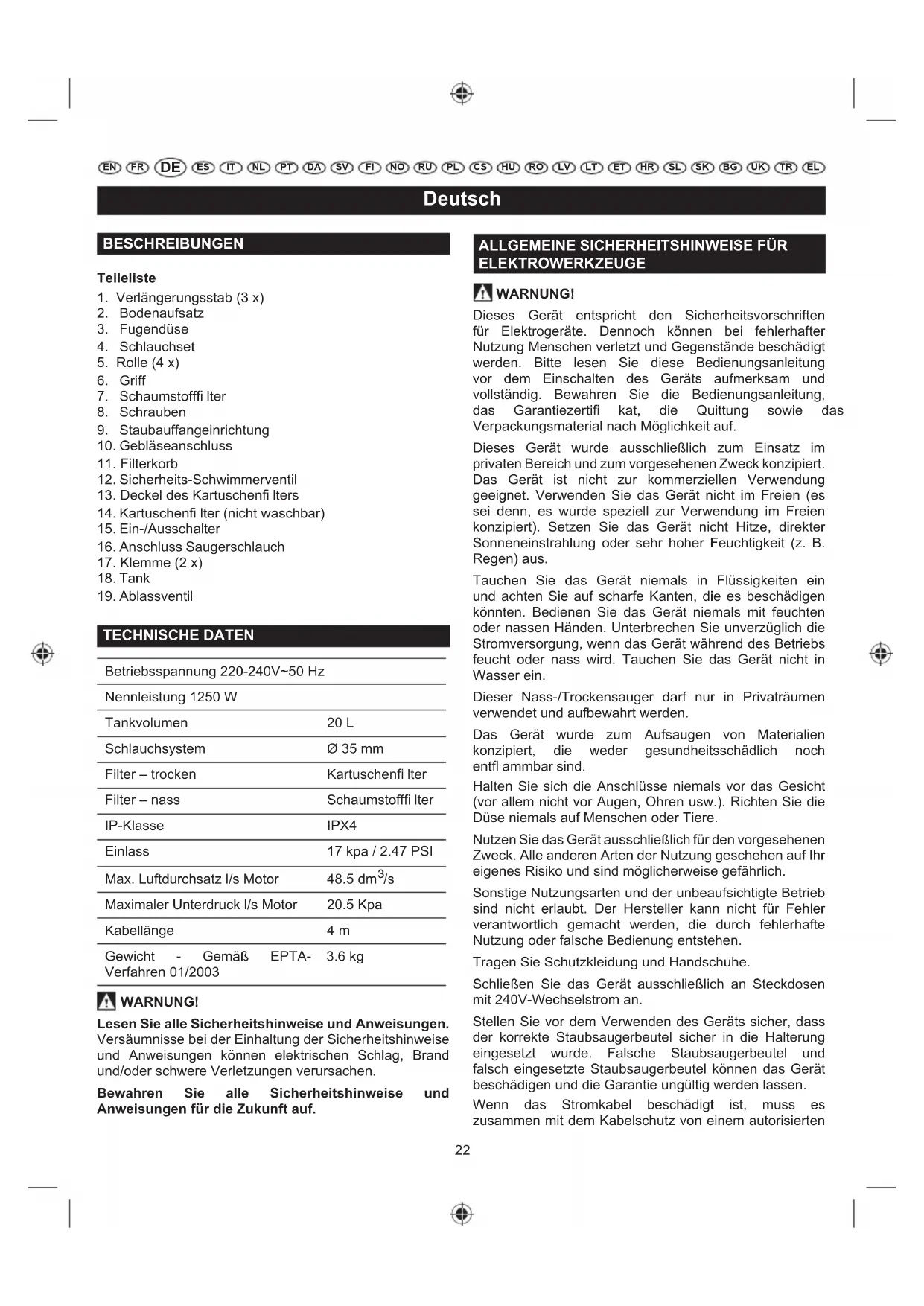 FEUCHT- UND TROCKEN-STRAUBSAUGER BEDIENUNGSANLEITUNG 22