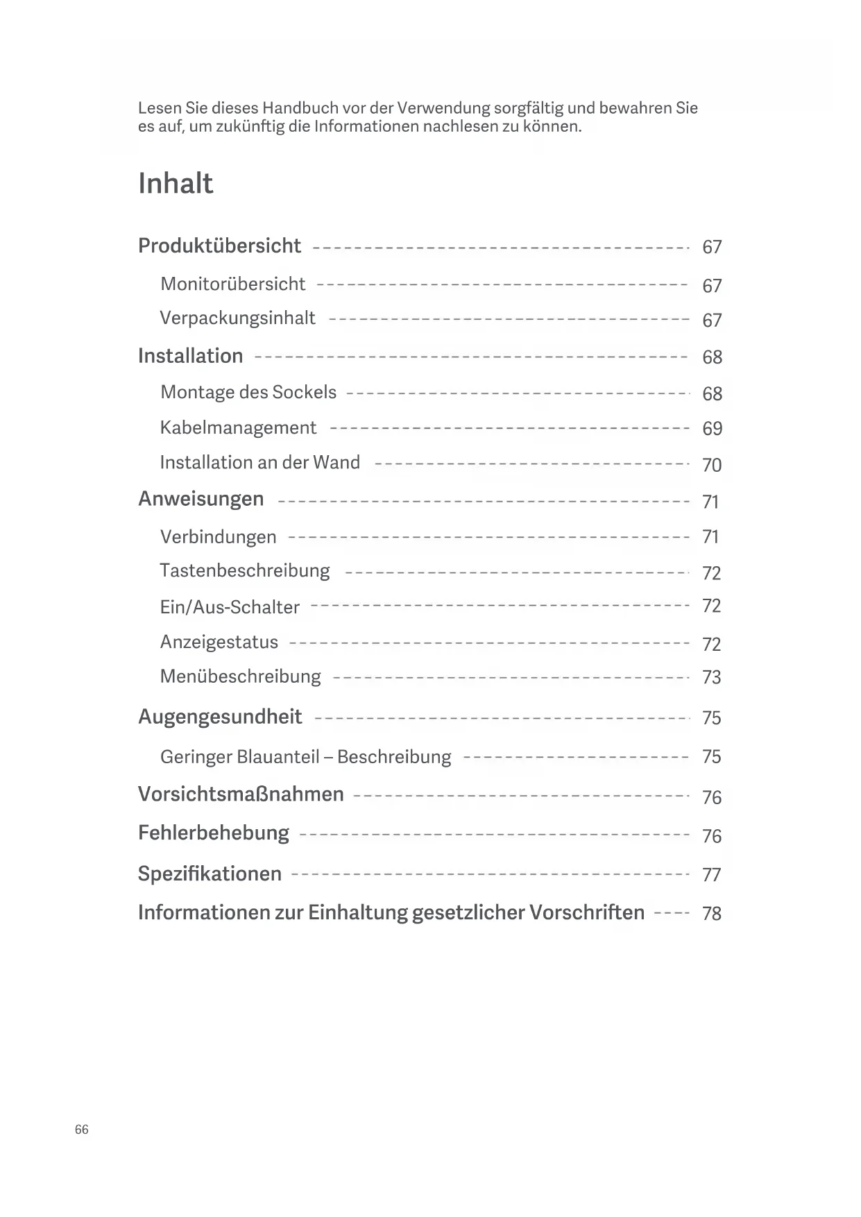 Produktübersicht Monitorübersicht Verpackungsinhalt Installation Montage des Sockels Kabelmanagement Installation an der Wand Anweisungen Verbindungen Tastenbeschreibung Ein/Aus-Schalter Anzeigestatus Menübeschreibung Vorsichtsmaßnahmen Fehlerbehebung