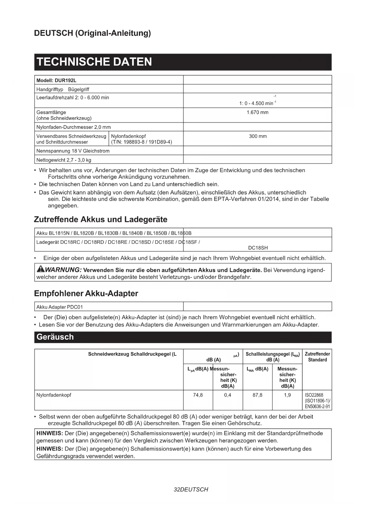 - Lesen Sie vor der Benutzung des Akku-Adapters die Anweisungen und Warnmarkierungen am Akku-Adapter. Geräusch Schneidwerkzeug Schalldruckpegel (L