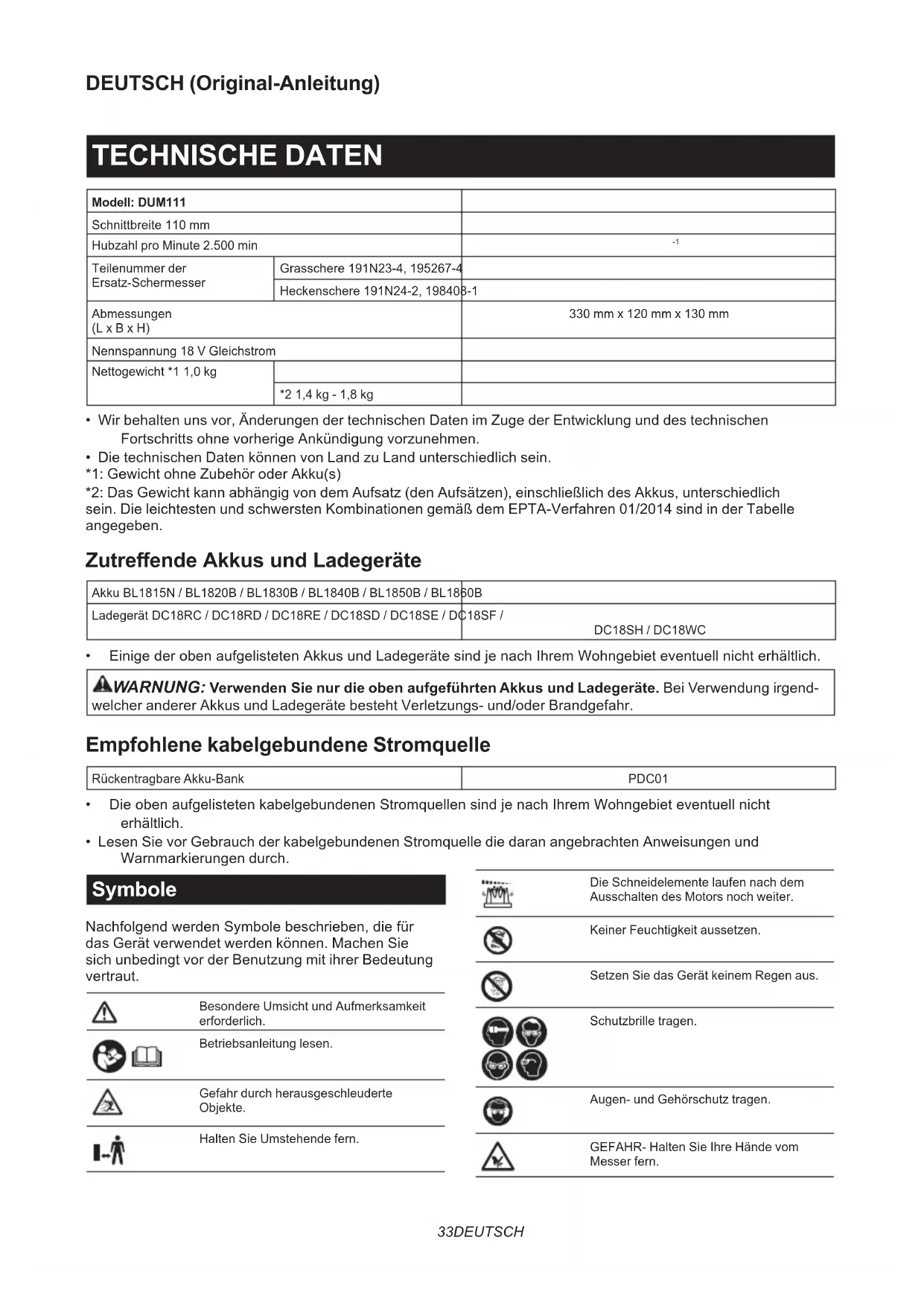 - Lesen Sie vor Gebrauch der kabelgebundenen Stromquelle die daran angebrachten Anweisungen und Warnmarkierungen durch. Symbole NachfolgendwerdenSymbolebeschrieben,diefür das Gerät verwendet werden können. Machen Sie sich unbedingt vor der Benutzung mit ihrer Bedeutung vertraut. Besondere Umsicht und Aufmerksamkeit erforderlich. Betriebsanleitung lesen. Gefahr durch herausgeschleuderte Objekte. Halten Sie Umstehende fern. Die Schneidelemente laufen nach dem Ausschalten des Motors noch weiter. Keiner Feuchtigkeit aussetzen. Setzen Sie das Gerät keinem Regen aus. Schutzbrille tragen. Augen- und Gehörschutz tragen. GEFAHR- Halten Sie Ihre Hände vom Messer fern.34 DEUTSCH Ni-MH Li-ion Nur für EU-Länder Aufgrund des Vorhandenseins gefähr- licher Komponenten in der Ausrüstung können Elektro- und Elektronik-Altgeräte, Akkumulatoren und Batterien sich nega- tiv auf die Umwelt und die menschliche Gesundheit auswirken. Entsorgen Sie Elektro- und Elektronikgeräte oder Batterien nicht mit dem Hausmüll! In Übereinstimmung mit der Europäischen Richtlinie über Elektro- und Elektronik- Altgeräte, Akkumulatoren und Batterien, verbrauchte Akkumulatoren und Batterien sowie ihrer Anpassung an nati- onales Recht sollten Elektro-Altgeräte, Batterien und Akkumulatoren gemäß den Umweltschutzbestimmungen getrennt gelagert und zu einer getrennten Sammelstelle für Siedlungsabfälle geliefert werden. Dies wird durch das am Gerät angebrachte SymbolderdurchgestrichenenAbfalltonne auf Rädern angezeigt. Garantierter Schallleistungspegel gemäß der EU-Richtlinie über Außenlärm. Schallleistungspegel gemäß der australi- schen NSW-Lärmschutzverordnung Vorgesehene Verwendung Das Werkzeug ist zum Schneiden von Rasenkanten oder Trieben vorgesehen. Geräusch TypischerA-bewerteterGeräuschpegelermitteltgemäßEN62841-4-5: DUM111 mit montiertem Schermesser für Grasschere Schalldruckpegel