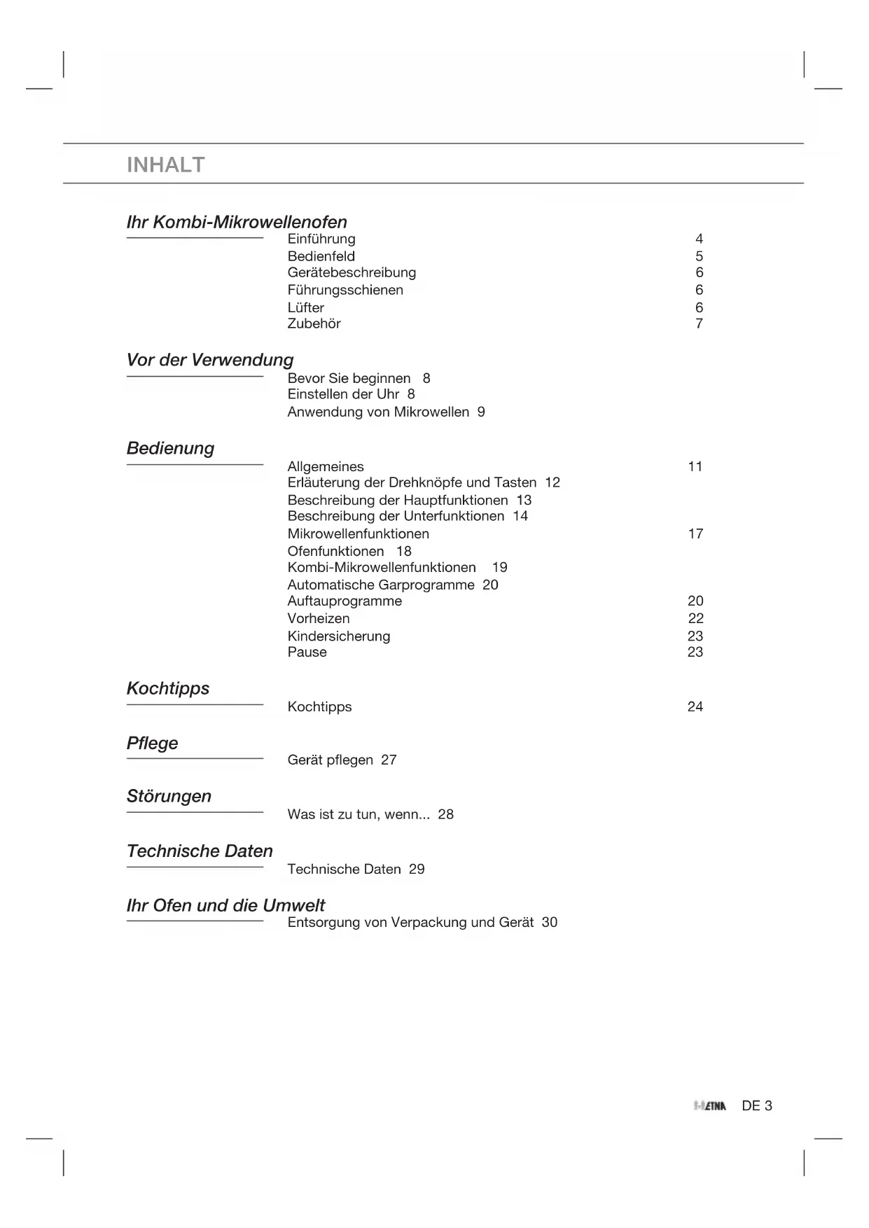 INHALT Ihr Kombi-Mikrowellenofen Einführung 4 Bedienfeld 5 Gerätebeschreibung 6 Führungsschienen 6 Lüfter 6 Zubehör 7 Vor der Verwendung Bevor Sie beginnen 8 Einstellen der Uhr 8 Anwendung von Mikrowellen 9 Bedienung Allgemeines 11 Erläuterung der Drehknöpfe und Tasten 12 Beschreibung der Hauptfunktionen 13 Beschreibung der Unterfunktionen 14 Mikrowellenfunktionen 17 Ofenfunktionen 18 Kombi-Mikrowellenfunktionen 19 Automatische Garprogramme 20 Auftauprogramme 20 Vorheizen 22 Kindersicherung 23 Pause 23 Kochtipps Kochtipps 24 Pflege Gerät pflegen 27 Störungen Was ist zu tun, wenn... 28 Technische Daten Technische Daten 29 Ihr Ofen und die Umwelt Entsorgung von Verpackung und Gerät 30DE 4 Einführung Das Kochen mit Ihrem neuen Mikrowellenofen ist sicher und komfortabel. Innerhalb kürzester Zeit bringen Sie die leckersten Speisen auf den Tisch. Die Bedienung des Gerätes ist denkbar einfach, auch dank der automatischen Programme zum Garen und Auftauen. Informationen zur Installation, Sicherheit, Bedienung und Wartung Ihres Gerätes finden Sie in dieser Bedienungsanleitung. Lesen Sie vor der Inbetriebnahme des Geräts die separaten Sicherheitshinweise! Lesen Sie diese Bedienungsanleitung vor der Verwendung des Geräts und bewahren Sie sie sorgfältig auf. Die Installationsanweisungen sind separat mitgeliefert. IHR KOMBI-MIKROWELLENOFENDE 5 IHR KOMBI-MIKROWELLENOFEN Bedienfeld