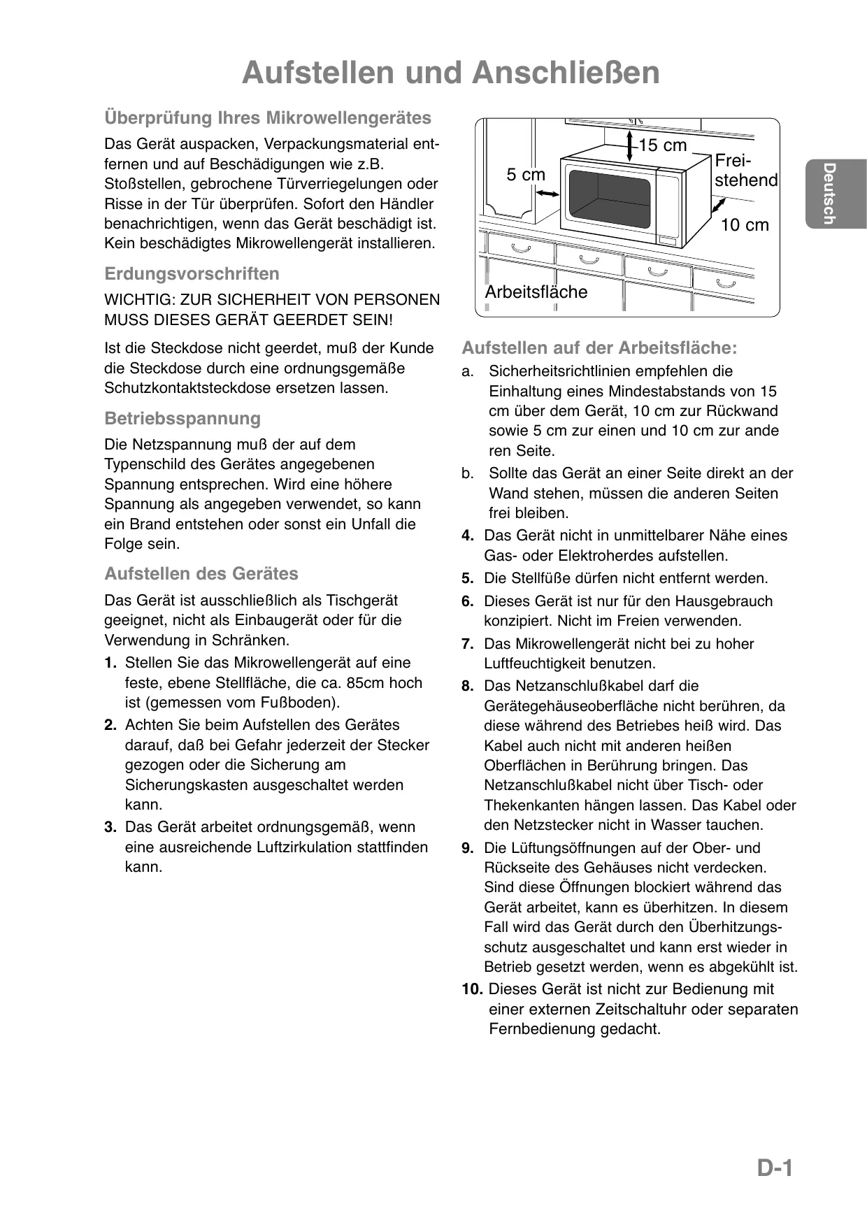 einer externen Zeitschaltuhr oder separaten Fernbedienung gedacht. D-1 Deutsch Das Gerät auspacken, Verpackungsmaterial entfernen und auf Beschädigungen wie z.B. Stoßstellen, gebrochene Türverriegelungen oder Risse in der Tür überprüfen. Sofort den Händler benachrichtigen, wenn das Gerät beschädigt ist. Kein beschädigtes Mikrowellengerät installieren. Aufstellen und Anschließen WARNUNG Wichtige Sicherheitshinweise