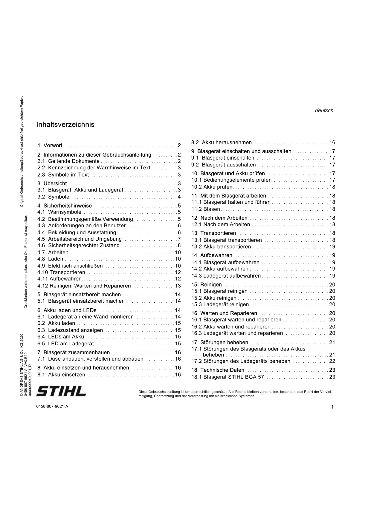 Druckfarben enthalten pflanzliche Öle, Papier ist recycelbar. © ANDREAS STIHL AG & Co. KG 2020 0458-807-9621-A. VA0.B20. 0000009040_001_D 0458-807-9621-A deutsch