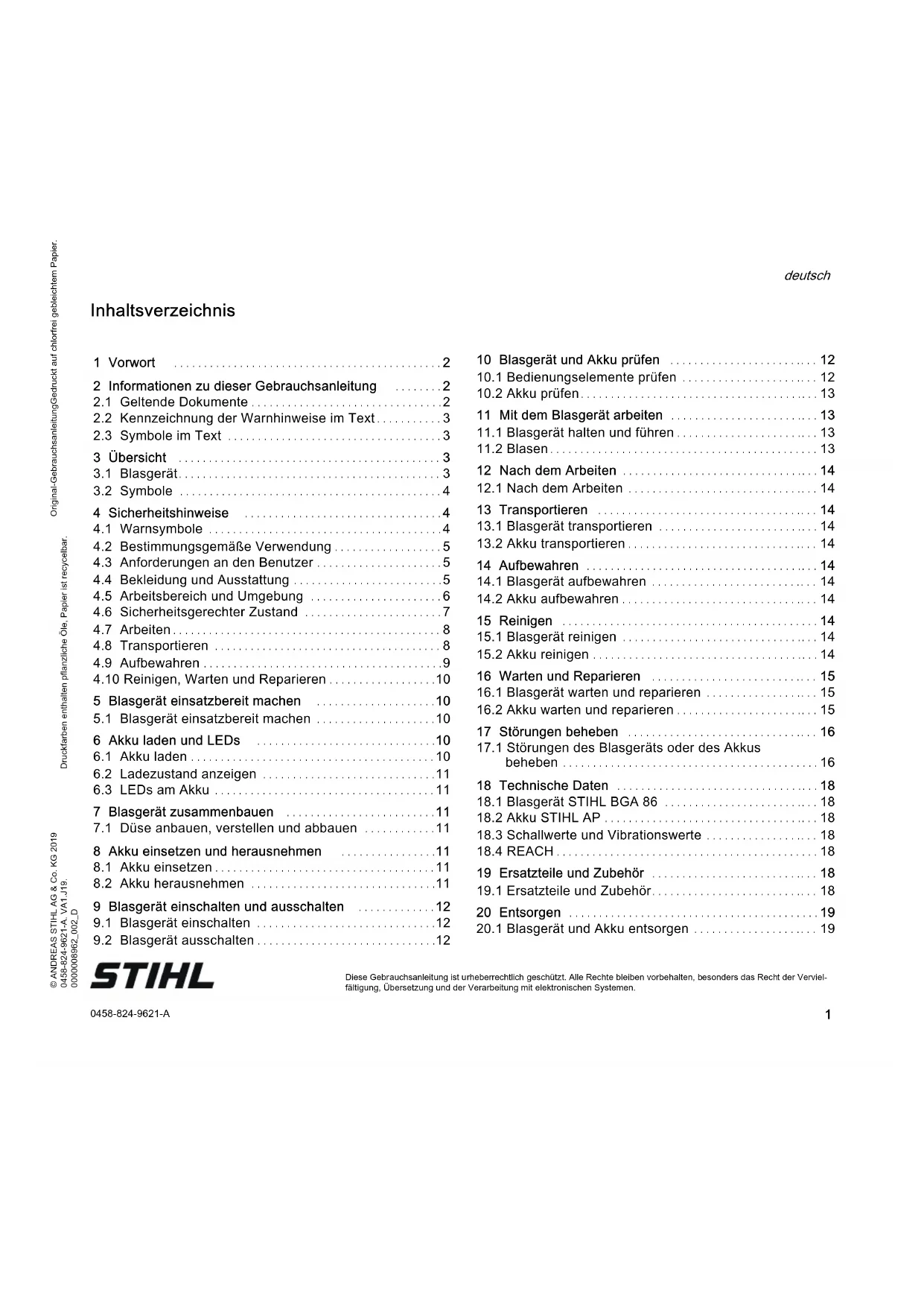Druckfarben enthalten pflanzliche Öle, Papier ist recycelbar. © ANDREAS STIHL AG & Co. KG 2019 0458-824-9621-A. VA1.J19. 0000008962_002_D 0458-824-9621-A deutsch