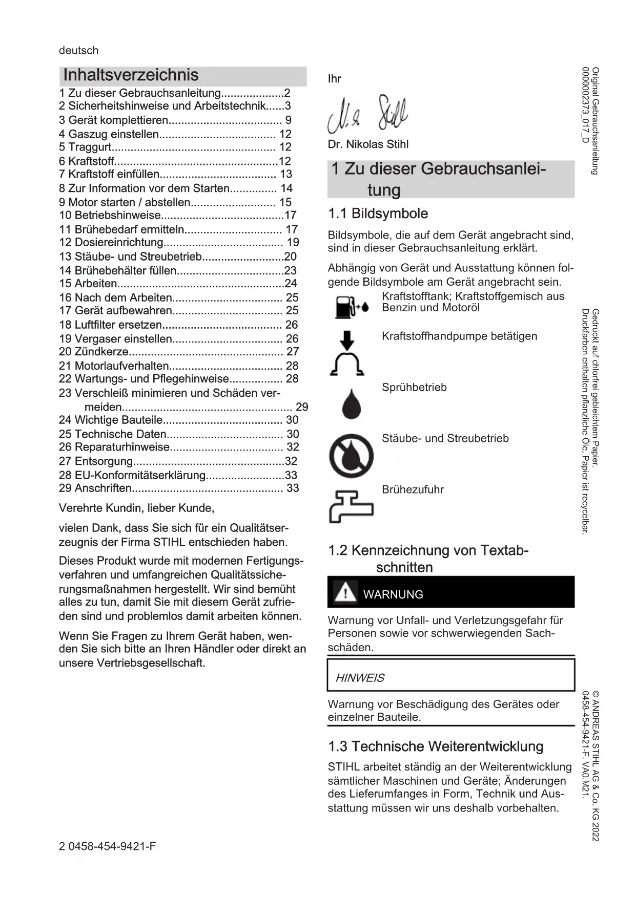- 29 Anschriften Verehrte Kundin, lieber Kunde, vielen Dank, dass Sie sich für ein Qualitätser‐ zeugnis der Firma STIHL entschieden haben. Dieses Produkt wurde mit modernen Fertigungs‐ verfahren und umfangreichen Qualitätssiche‐ rungsmaßnahmen hergestellt. Wir sind bemüht alles zu tun, damit Sie mit diesem Gerät zufrie‐ den sind und problemlos damit arbeiten können. Wenn Sie Fragen zu Ihrem Gerät haben, wen‐ den Sie sich bitte an Ihren Händler oder direkt an unsere Vertriebsgesellschaft. Ihr Dr. Nikolas Stihl 1 Zu dieser Gebrauchsanlei‐ tung p. 33