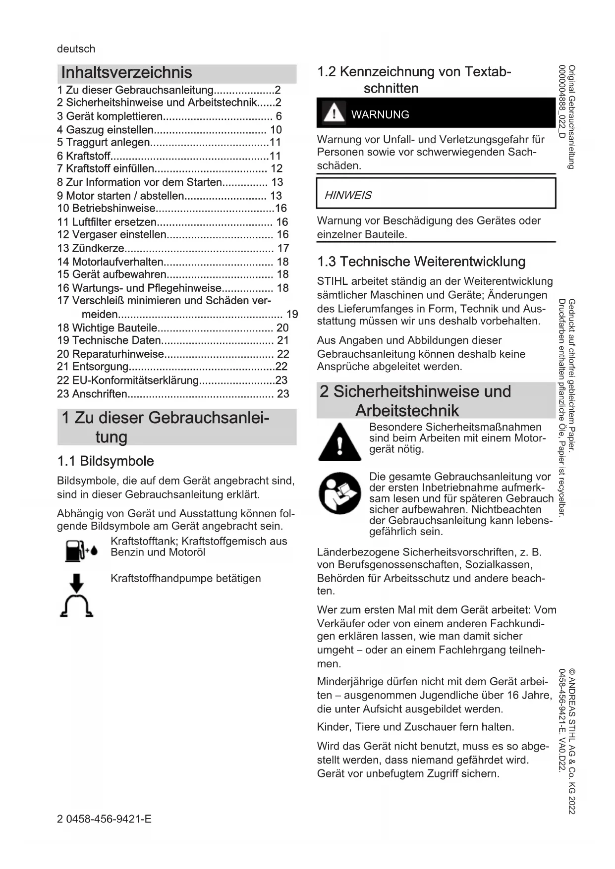 STIHL arbeitet ständig an der Weiterentwicklung sämtlicher Maschinen und Geräte; Änderungen des Lieferumfanges in Form, Technik und Aus‐ stattung müssen wir uns deshalb vorbehalten. Aus Angaben und Abbildungen dieser Gebrauchsanleitung können deshalb keine Ansprüche abgeleitet werden. 2 Sicherheitshinweise und Arbeitstechnik Besondere Sicherheitsmaßnahmen sind beim Arbeiten mit einem Motor‐ gerät nötig. Die gesamte Gebrauchsanleitung vor der ersten Inbetriebnahme aufmerk‐ sam lesen und für späteren Gebrauch sicher aufbewahren. Nichtbeachten der Gebrauchsanleitung kann lebens‐ gefährlich sein. Länderbezogene Sicherheitsvorschriften, z. B. von Berufsgenossenschaften, Sozialkassen, Behörden für Arbeitsschutz und andere beach‐ ten. Wer zum ersten Mal mit dem Gerät arbeitet: Vom Verkäufer oder von einem anderen Fachkundi‐ gen erklären lassen, wie man damit sicher umgeht – oder an einem Fachlehrgang teilneh‐ men. Minderjährige dürfen nicht mit dem Gerät arbei‐ ten – ausgenommen Jugendliche über 16 Jahre, die unter Aufsicht ausgebildet werden. Kinder, Tiere und Zuschauer fern halten. Wird das Gerät nicht benutzt, muss es so abge‐ stellt werden, dass niemand gefährdet wird. Gerät vor unbefugtem Zugriff sichern. deutsch 2 0458-456-9421-E © ANDREAS STIHL AG & Co. KG 2022 0458-456-9421-E. VA0.D22. Gedruckt auf chlorfrei gebleichtem Papier. Druckfarben enthalten pflanzliche Öle, Papier ist recycelbar. Original Gebrauchsanleitung 0000004888_022_DDer Benutzer ist verantwortlich für Unfälle oder Gefahren, die gegenüber anderen Personen oder deren Eigentum auftreten. Gerät nur an Personen weiter geben oder auslei‐ hen, die mit diesem Modell und seiner Handha‐ bung vertraut sind – stets die Gebrauchsanlei‐ tung mitgeben. Der Einsatz Schall emittierender Geräte kann durch nationale wie auch örtliche, lokale Vor‐ schriften zeitlich begrenzt sein. Gerät nur dann in Betrieb nehmen, wenn alle Bauteile unbeschädigt sind. Zur Reinigung des Gerätes keine Hochdruckrei‐ niger verwenden. Der harte Wasserstrahl kann Teile des Gerätes beschädigen.