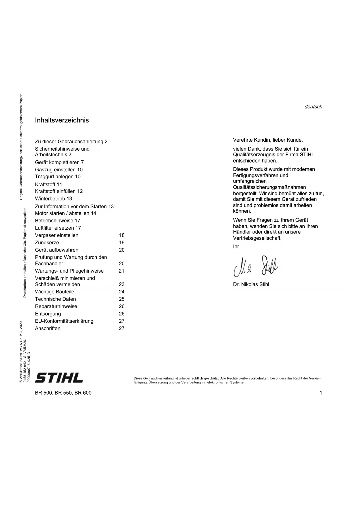 Diese Gebrauchsanleitung ist urheberrechtlich geschützt. Alle Rechte bleiben vorbehalten, besonders das Recht der Verviel- fältigung, Übersetzung und der Verarbeitung mit elektronischen Systemen. Inhaltsverzeichnis Verehrte Kundin, lieber Kunde, vielen Dank, dass Sie sich für ein Qualitätserzeugnis der Firma STIHL entschieden haben. Dieses Produkt wurde mit modernen Fertigungsverfahren und umfangreichen Qualitätssicherungsmaßnahmen hergestellt. Wir sind bemüht alles zu tun, damit Sie mit diesem Gerät zufrieden sind und problemlos damit arbeiten können. Wenn Sie Fragen zu Ihrem Gerät haben, wenden Sie sich bitte an Ihren Händler oder direkt an unsere Vertriebsgesellschaft. Ihr Dr. Nikolas Stihl Zu dieser Gebrauchsanleitung 2 Sicherheitshinweise und Arbeitstechnik 2 Gerät komplettieren 7 Gaszug einstellen 10 Traggurt anlegen 10 Kraftstoff 11 Kraftstoff einfüllen 12 Winterbetrieb 13 Zur Information vor dem Starten 13 Motor starten / abstellen 14 Betriebshinweise 17 Luftfilter ersetzen 17 Vergaser einstellen 18 Zündkerze 19 Gerät aufbewahren 20 Prüfung und Wartung durch den Fachhändler 20 Wartungs- und Pflegehinweise 21 Verschleiß minimieren und Schäden vermeiden 23 Wichtige Bauteile 24 Technische Daten 25 Reparaturhinweise 26 Entsorgung 26 EU-Konformitätserklärung 27 Anschriften 27BR 500, BR 550, BR 600 deutsch