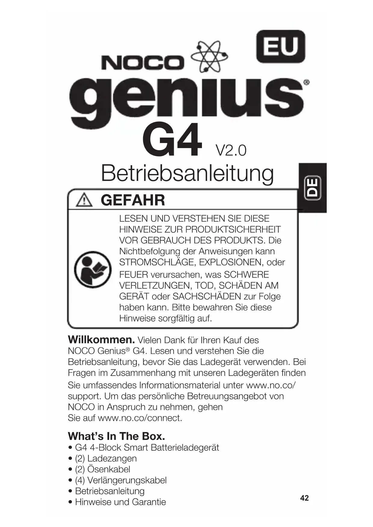 - G4 4-Block Smart Batterieladegerät• (2) Ladezangen• (2) Ösenkabel• (4) Verlängerungskabel• Betriebsanleitung• Hinweise und Garantie Betriebsanleitung G4 V2.0 LESEN UND VERSTEHEN SIE DIESE HINWEISE ZUR PRODUKTSICHERHEIT VOR GEBRAUCH DES PRODUKTS. Die Nichtbefolgung der Anweisungen kann STROMSCHLÄGE, EXPLOSIONEN, oder FEUER verursachen, was SCHWERE VERLETZUNGEN, TOD, SCHÄDEN AM GERÄT oder SACHSCHÄDEN zur Folge haben kann. Bitte bewahren Sie diese Hinweise sorgfältig auf. GEFAHRKontakt zu NOCO. Über das G4. NOCO Genius