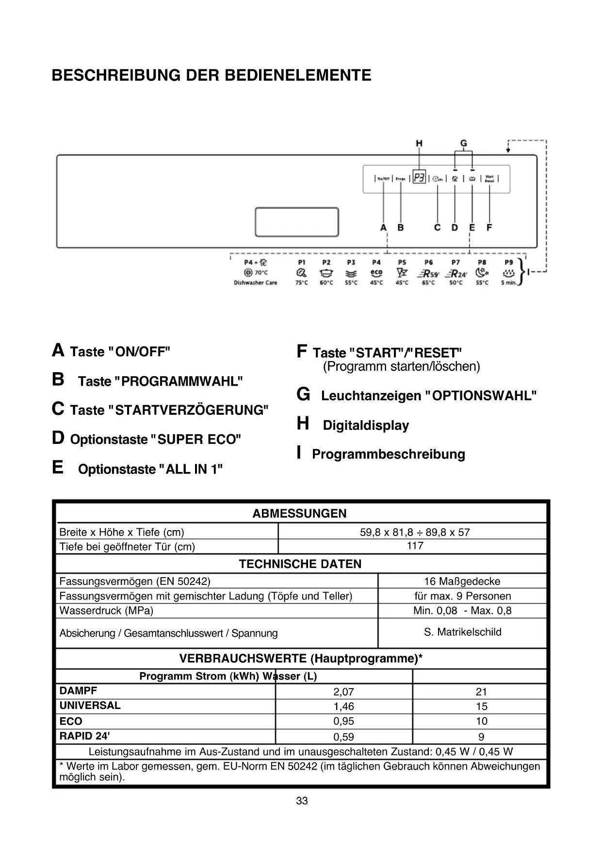 Digitaldisplay I Programmbeschreibung ABMESSUNGEN TECHNISCHE DATEN VERBRAUCHSWERTE (Hauptprogramme)* Programm Strom (kWh) Wasser (L) DAMPF UNIVERSAL ECO RAPID 24' Breite x Höhe x Tiefe (cm) Tiefe bei geöffneter Tür (cm) Fassungsvermögen (EN 50242) Fassungsvermögen mit gemischter Ladung (Töpfe und Teller) Wasserdruck (MPa) Absicherung / Gesamtanschlusswert / Spannung 16 Maßgedecke für max. 9 Personen Min. 0,08 - Max. 0,8 S. Matrikelschild Leistungsaufnahme im Aus-Zustand und im unausgeschalteten Zustand: 0,45 W / 0,45 W