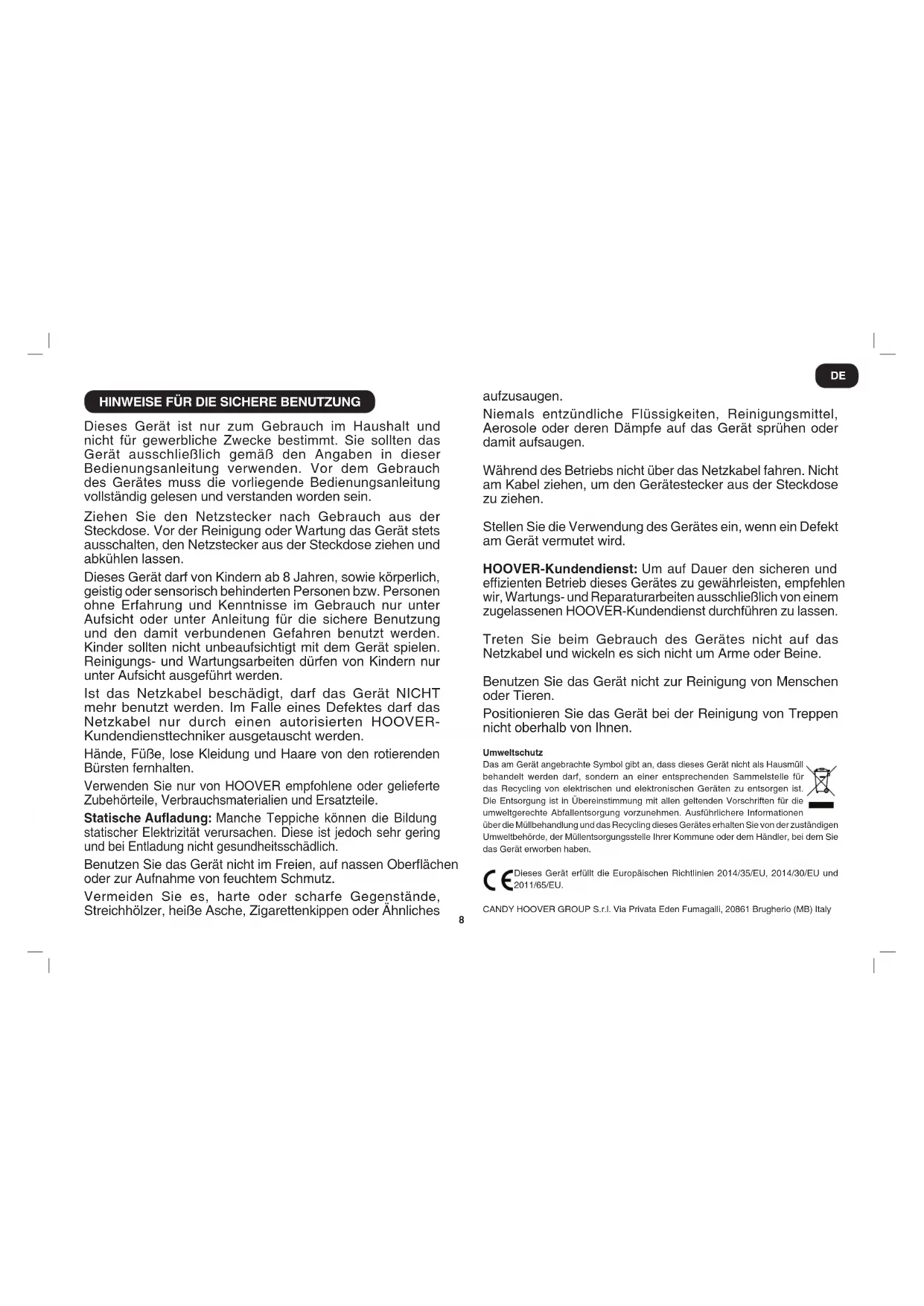 Dieses Gerät ist nur zum Gebrauch im Haushalt und nicht für gewerbliche Zwecke bestimmt. Sie sollten das Gerät ausschließlich gemäß den Angaben in dieser Bedienungsanleitung verwenden. Vor dem Gebrauch des Gerätes muss die vorliegende Bedienungsanleitung vollständig gelesen und verstanden worden sein. Ziehen Sie den Netzstecker nach Gebrauch aus der Steckdose. Vor der Reinigung oder Wartung das Gerät stets ausschalten, den Netzstecker aus der Steckdose ziehen und abkühlen lassen. Dieses Gerät darf von Kindern ab 8 Jahren, sowie körperlich, geistig oder sensorisch behinderten Personen bzw. Personen ohne Erfahrung und Kenntnisse im Gebrauch nur unter Aufsicht oder unter Anleitung für die sichere Benutzung und den damit verbundenen Gefahren benutzt werden. Kinder sollten nicht unbeaufsichtigt mit dem Gerät spielen. Reinigungs- und Wartungsarbeiten dürfen von Kindern nur unter Aufsicht ausgeführt werden. Ist das Netzkabel beschädigt, darf das Gerät NICHT mehr benutzt werden. Im Falle eines Defektes darf das Netzkabel nur durch einen autorisierten HOOVER- Kundendiensttechniker ausgetauscht werden. Hände, Füße, lose Kleidung und Haare von den rotierenden Bürsten fernhalten. Verwenden Sie nur von HOOVER empfohlene oder gelieferte Zubehörteile, Verbrauchsmaterialien und Ersatzteile. StatischeAuadung:Manche Teppiche können die Bildung statischer Elektrizität verursachen. Diese ist jedoch sehr gering und bei Entladung nicht gesundheitsschädlich. Benutzen Sie das Gerät nicht im Freien, auf nassen Oberächen oder zur Aufnahme von feuchtem Schmutz. Vermeiden Sie es, harte oder scharfe Gegenstände, Streichhölzer, heiße Asche, Zigarettenkippen oder Ähnliches aufzusaugen. Niemals entzündliche Flüssigkeiten, Reinigungsmittel, Aerosole oder deren Dämpfe auf das Gerät sprühen oder damit aufsaugen. Während des Betriebs nicht über das Netzkabel fahren. Nicht am Kabel ziehen, um den Gerätestecker aus der Steckdose zu ziehen. Stellen Sie die Verwendung des Gerätes ein, wenn ein Defekt am Gerät vermutet wird. HOOVER-Kundendienst: Um auf Dauer den sicheren und efzienten Betrieb dieses Gerätes zu gewährleisten, empfehlen wir, Wartungs- und Reparaturarbeiten ausschließlich von einem zugelassenen HOOVER-Kundendienst durchführen zu lassen. Treten Sie beim Gebrauch des Gerätes nicht auf das Netzkabel und wickeln es sich nicht um Arme oder Beine. Benutzen Sie das Gerät nicht zur Reinigung von Menschen oder Tieren. Positionieren Sie das Gerät bei der Reinigung von Treppen nicht oberhalb von Ihnen. Umweltschutz Das am Gerät angebrachte Symbol gibt an, dass dieses Gerät nicht als Hausmüll behandelt werden darf, sondern an einer entsprechenden Sammelstelle für das Recycling von elektrischen und elektronischen Geräten zu entsorgen ist. Die Entsorgung ist in Übereinstimmung mit allen geltenden Vorschriften für die umweltgerechte Abfallentsorgung vorzunehmen. Ausführlichere Informationen über die Müllbehandlung und das Recycling dieses Gerätes erhalten Sie von der zuständigen Umweltbehörde, der Müllentsorgungsstelle Ihrer Kommune oder dem Händler, bei dem Sie das Gerät erworben haben. Dieses Gerät erfüllt die Europäischen Richtlinien 2014/35/EU, 2014/30/EU und 2011/65/EU. CANDY HOOVER GROUP S.r.l. Via Privata Eden Fumagalli, 20861 Brugherio (MB) Italy DE9 GERÄTEBESCHREIBUNG A. Zubehörfachabdeckung B. Gerätechassis C. Staubbehälterfachabdeckung D. Mechanische Staubbehälterfüllanzeige* E. EIN-/AUS-Schalter F. Abdeckung für Abluftlter G. Fußtaste für automatische Kabelaufwicklung H. Schieberegler für elektronische Leistungsregulierung** H1. LED-Anzeigebildschirm mit variabler Leistungsregulierung** und Staubbeutelfüllanzeige-LED*
