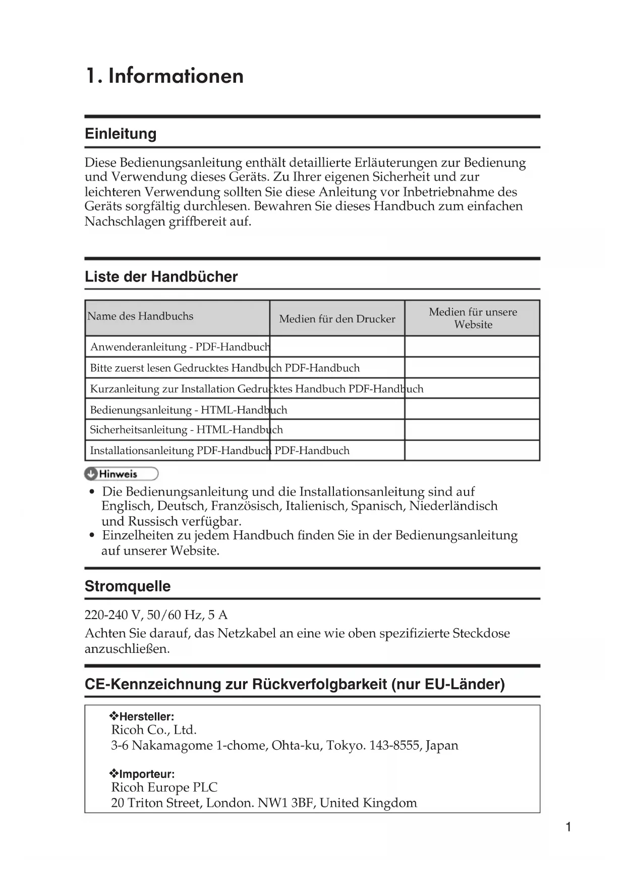 - Einzelheiten zu jedem Handbuch nden Sie in der Bedienungsanleitung auf unserer Website. Stromquelle 220-240 V, 50/60 Hz, 5 A Achten Sie darauf, das Netzkabel an eine wie oben spezifizierte Steckdose anzuschließen. CE-Kennzeichnung zur Rückverfolgbarkeit (nur EU-Länder) ❖ Hersteller: Ricoh Co., Ltd. 3-6 Nakamagome 1-chome, Ohta-ku, Tokyo. 143-8555, Japan ❖ Importeur: Ricoh Europe PLC 20 Triton Street, London. NW1 3BF, United Kingdom2 Haftungsausschluss Soweit gesetzlich zulässig haftet der Hersteller in keinem Fall für jegliche Schäden, die sich aus einem Versagen dieses Geräts, Verlusten von Dokumenten oder Daten oder der Verwendung bzw. Nichtverwendung dieses Produkts und den damit gelieferten Handbüchern ergeben. Stellen Sie sicher, dass Sie stets Kopien oder Sicherungen der im Gerät gespeicherten Daten besitzen. Dokumente oder Daten könnten aufgrund von Bedienungsfehlern oder Störungen des Geräts gelöscht werden. In keinem Fall haftet der Hersteller für von Ihnen mit diesem Gerät erstellte Dokumente oder Ergebnisse aus den von Ihnen verwendeten Daten. Hinweise Um eine gute Ausgabequalität zu erzielen, empfiehlt der Hersteller, den Originaltoner des Herstellers zu verwenden. Der Hersteller kann nicht für Schäden oder Kosten verantwortlich gemacht werden, die entstehen, wenn keine Originalteile des Herstellers in Ihren Büroprodukten verwendet werden.3