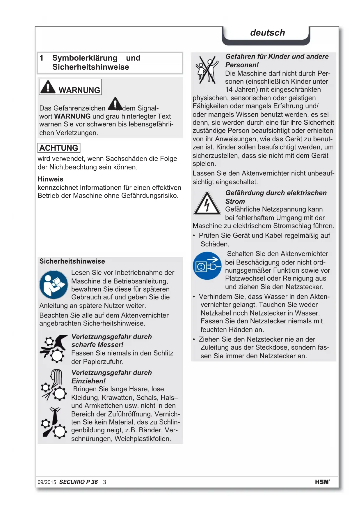 - türkçe: Evrak İmha Makinesi SECURIO P36 9/2015 SECURIO P 36 3 deutsch 1 Symbolerklärung und Sicherheitshinweise Sicherheitshinweise Lesen Sie vor Inbetriebnahme der Maschine die Betriebsanleitung, bewahren Sie diese für späteren Gebrauch auf und geben Sie die Anleitung an spätere Nutzer weiter. Beachten Sie alle auf dem Aktenvernichter angebrachten Sicherheitshinweise. Verletzungsgefahr durch scharfe Messer! Fassen Sie niemals in den Schlitz der Papierzufuhr. Verletzungsgefahr durch Einziehen! Bringen Sie lange Haare, lose Kleidung, Krawatten, Schals, Hals– und Armkettchen usw. nicht in den Bereich der Zuführöffnung. Vernich- ten Sie kein Material, das zu Schlin- genbildung neigt, z.B. Bänder, Ver- schnürungen, Weichplastikfolien. Hinweis kennzeichnet Informationen für einen effektiven Betrieb der Maschine ohne Gefährdungsrisiko. ACHTUNG wird verwendet, wenn Sachschäden die Folge der Nichtbeachtung sein können. WARNUNG Das Gefahrenzeichen mit dem Signal- wort WARNUNG und grau hinterlegter Text warnen Sie vor schweren bis lebensgefährli- chen Verletzungen. Gefahren für Kinder und andere Personen! Die Maschine darf nicht durch Per- sonen (einschließlich Kinder unter 14 Jahren) mit eingeschränkten physischen, sensorischen oder geistigen Fähigkeiten oder mangels Erfahrung und/ oder mangels Wissen benutzt werden, es sei denn, sie werden durch eine für ihre Sicherheit zuständige Person beaufsichtigt oder erhielten von ihr Anweisungen, wie das Gerät zu benut- zen ist. Kinder sollen beaufsichtigt werden, um sicherzustellen, dass sie nicht mit dem Gerät spielen. Lassen Sie den Aktenvernichter nicht unbeauf- sichtigt eingeschaltet. Gefährdung durch elektrischen Strom Gefährliche Netzspannung kann bei fehlerhaftem Umgang mit der Maschine zu elektrischem Stromschlag führen. p. 1710