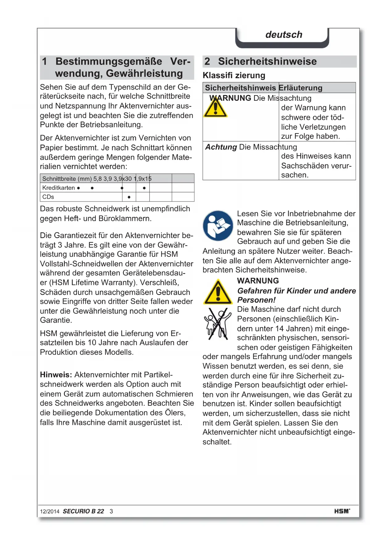 - türkçe: Evrak İmha Makinesi SECURIO B222 2/2014 SECURIO B 22 3 deutsch 2 Sicherheitshinweise Klassifi zierung Sicherheitshinweis Erläuterung WARNUNG Die Missachtung der Warnung kann schwere oder töd- liche Verletzungen zur Folge haben. Achtung Die Missachtung des Hinweises kann Sachschäden verur- sachen. Lesen Sie vor Inbetriebnahme der Maschine die Betriebsanleitung, bewahren Sie sie für späteren Gebrauch auf und geben Sie die Anleitung an spätere Nutzer weiter. Beach- ten Sie alle auf dem Aktenvernichter ange- brachten Sicherheitshinweise. WARNUNG Gefahren für Kinder und andere Personen! Die Maschine darf nicht durch Personen (einschließlich Kin- dern unter 14 Jahren) mit einge- schränkten physischen, sensori- schen oder geistigen Fähigkeiten oder mangels Erfahrung und/oder mangels Wissen benutzt werden, es sei denn, sie werden durch eine für ihre Sicherheit zu- ständige Person beaufsichtigt oder erhiel- ten von ihr Anweisungen, wie das Gerät zu benutzen ist. Kinder sollen beaufsichtigt werden, um sicherzustellen, dass sie nicht mit dem Gerät spielen. Lassen Sie den Aktenvernichter nicht unbeaufsichtigt einge- schaltet. 1 Bestimmungsgemäße Ver- wendung, Gewährleistung Sehen Sie auf dem Typenschild an der Ge- räterückseite nach, für welche Schnittbreite und Netzspannung Ihr Aktenvernichter aus- gelegt ist und beachten Sie die zutreffenden Punkte der Betriebsanleitung. Der Aktenvernichter ist zum Vernichten von Papier bestimmt. Je nach Schnittart können außerdem geringe Mengen folgender Mate- rialien vernichtet werden: Schnittbreite (mm) 5,8 3,9 3,9x30 1,9x15 Kreditkarten ●● ● ● CDs ● Das robuste Schneidwerk ist unempfi ndlich gegen Heft- und Büroklammern. Hinweis: Aktenvernichter mit Partikel- schneidwerk werden als Option auch mit einem Gerät zum automatischen Schmieren des Schneidwerks angeboten. Beachten Sie die beiliegende Dokumentation des Ölers, falls Ihre Maschine damit ausgerüstet ist. Die Garantiezeit für den Aktenvernichter be- trägt 3 Jahre. Es gilt eine von der Gewähr- leistung unabhängige Garantie für HSM Vollstahl-Schneidwellen der Aktenvernichter während der gesamten Gerätelebensdau- er (HSM Lifetime Warranty). Verschleiß, Schäden durch unsachgemäßen Gebrauch sowie Eingriffe von dritter Seite fallen weder unter die Gewährleistung noch unter die Garantie. HSM gewährleistet die Lieferung von Er- satzteilen bis 10 Jahre nach Auslaufen der Produktion dieses Modells.4 SECURIO B 22 12/2014 deutsch WARNUNG Gefährliche Netzspannung! Fehlerhafter Umgang mit der Maschine kann zu elektrischem Stromschlag führen. – Überprüfen Sie vor dem Einstecken des Netzsteckers, dass Spannung und Fre- quenz Ihres Stromnetzes mit den Anga- ben auf dem Typenschild übereinstim- men. – Achten Sie darauf, dass der Netzstecker leicht erreichbar ist. – Vermeiden Sie, dass Wasser in den Aktenvernichter gelangt. Tauchen Sie weder Netzkabel noch Netzstecker in Wasser. – Fassen Sie den Netzstecker niemals mit feuchten Händen an. – Ziehen Sie den Netzstecker nie an der Zuleitung aus der Steckdose, sondern fassen Sie immer den Netzstecker an. – Verwenden Sie das Gerät nur in trocke- nen Innenräumen. Betreiben Sie es nie in Feuchträumen oder im Regen. Prüfen Sie Gerät und Kabel regel- mäßig auf Schäden. Schalten Sie den Aktenvernichter bei Beschädi- gung oder nicht ordnungsgemä- ßer Funktion sowie vor Platzwechsel oder Reinigung aus und ziehen Sie den Netz- stecker. – Halten Sie das Gerät, den Netzstecker und das Netzkabel von offenem Feuer und heißen Flächen fern. Die Lüftungs- schlitze müssen frei sein und ein Abstand zur Wand oder zu Möbeln von min. 5 cm eingehalten werden. Servicearbeiten, die mit dem Entfernen von Gehäuse- abdeckungen verbunden sind, dürfen nur vom HSM- Kundendienst und Service p. 1501
