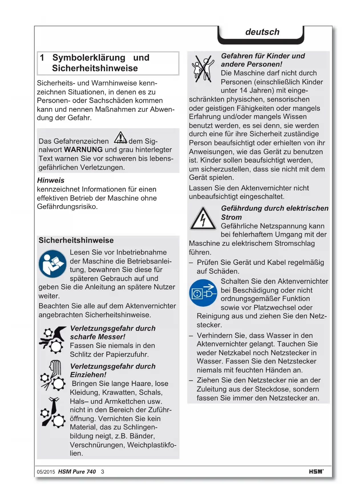 - türkçe: Evrak İmha Makinesi HSM Pure 740 5/2015 HSM Pure 740 3 deutsch 1 Symbolerklärung und Sicherheitshinweise Sicherheits- und Warnhinweise kenn- zeichnen Situationen, in denen es zu Personen- oder Sachschäden kommen kann und nennen Maßnahmen zur Abwen- dung der Gefahr. Hinweis kennzeichnet Informationen für einen effektiven Betrieb der Maschine ohne Gefährdungsrisiko. Das Gefahrenzeichen mit dem Sig- nalwort WARNUNG und grau hinterlegter Text warnen Sie vor schweren bis lebens- gefährlichen Verletzungen. Sicherheitshinweise Lesen Sie vor Inbetriebnahme der Maschine die Betriebsanlei- tung, bewahren Sie diese für späteren Gebrauch auf und geben Sie die Anleitung an spätere Nutzer weiter. Beachten Sie alle auf dem Aktenvernichter angebrachten Sicherheitshinweise. Verletzungsgefahr durch scharfe Messer! Fassen Sie niemals in den Schlitz der Papierzufuhr. Verletzungsgefahr durch Einziehen! Bringen Sie lange Haare, lose Kleidung, Krawatten, Schals, Hals– und Armkettchen usw. nicht in den Bereich der Zuführ- öffnung. Vernichten Sie kein Material, das zu Schlingen- bildung neigt, z.B. Bänder, Verschnürungen, Weichplastikfo- lien. Gefahren für Kinder und andere Personen! Die Maschine darf nicht durch Personen (einschließlich Kinder unter 14 Jahren) mit einge- schränkten physischen, sensorischen oder geistigen Fähigkeiten oder mangels Erfahrung und/oder mangels Wissen benutzt werden, es sei denn, sie werden durch eine für ihre Sicherheit zuständige Person beaufsichtigt oder erhielten von ihr Anweisungen, wie das Gerät zu benutzen ist. Kinder sollen beaufsichtigt werden, um sicherzustellen, dass sie nicht mit dem Gerät spielen. Lassen Sie den Aktenvernichter nicht unbeaufsichtigt eingeschaltet. Gefährdung durch elektrischen Strom Gefährliche Netzspannung kann bei fehlerhaftem Umgang mit der Maschine zu elektrischem Stromschlag führen. – Prüfen Sie Gerät und Kabel regelmäßig auf Schäden. Schalten Sie den Aktenvernichter bei Beschädigung oder nicht ordnungsgemäßer Funktion sowie vor Platzwechsel oder Reinigung aus und ziehen Sie den Netz- stecker. – Verhindern Sie, dass Wasser in den Aktenvernichter gelangt. Tauchen Sie weder Netzkabel noch Netzstecker in Wasser. Fassen Sie den Netzstecker niemals mit feuchten Händen an. – Ziehen Sie den Netzstecker nie an der Zuleitung aus der Steckdose, sondern fassen Sie immer den Netzstecker an.4 HSM Pure 740 05/2015 deutsch p. 1500
