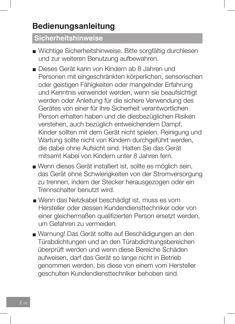- Allgemeine Richtlinien 71-72 Deutsch Sicherheitshinweise -8 Käse 124 Desserts 126-128 Konfitüre 131-132 1 DE Bedienungsanleitung Sicherheitshinweise Wichtige Sicherheitshinweise. Bitte sorgfältig durchlesen und zur weiteren Benutzung aufbewahren. Dieses Gerät kann von Kindern ab 8 Jahren und Personen mit eingeschränkten körperlichen, sensorischen oder geistigen Fähigkeiten oder mangelnder Erfahrung und Kenntnis verwendet werden, wenn sie beaufsichtigt werden oder Anleitung für die sichere Verwendung des Gerätes von einer für ihre Sicherheit verantwortlichen Person erhalten haben und die diesbezüglichen Risiken verstehen, auch bezüglich entweichendem Dampf. Kinder sollten mit dem Gerät nicht spielen. Reinigung und Wartung sollte nicht von Kindern durchgeführt werden, die dabei ohne Aufsicht sind. Halten Sie das Gerät mitsamt Kabel von Kindern unter 8 Jahren fern. Wenn dieses Gerät installiert ist, sollte es möglich sein, das Gerät ohne Schwierigkeiten von der Stromversorgung zu trennen, indem der Stecker herausgezogen oder ein Trennschalter benutzt wird. Wenn das Netzkabel beschädigt ist, muss es vom Hersteller oder dessen Kundendiensttechniker oder von einer gleichermaßen qualifizierten Person ersetzt werden, um Gefahren zu vermeiden. Warnung! Das Gerät sollte auf Beschädigungen an den Türabdichtungen und an den Türabdichtungsbereichen überprüft werden und wenn diese Bereiche Schäden aufweisen, darf das Gerät so lange nicht in Betrieb genommen werden, bis diese von einem vom Hersteller geschulten Kundendiensttechniker behoben sind. p. 2