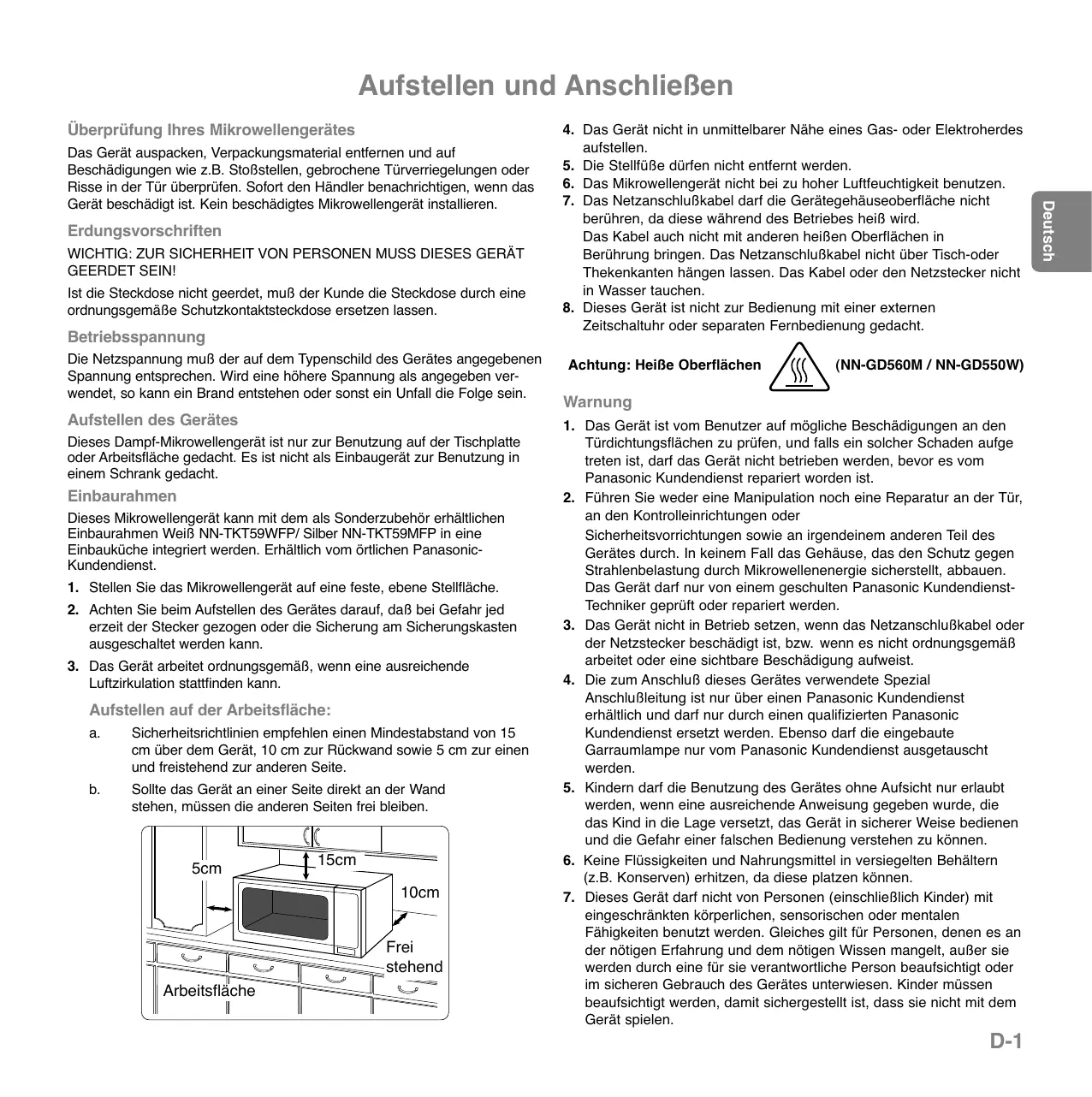 Sollte das Gerät an einer Seite direkt an der Wand stehen, müssen die anderen Seiten frei bleiben. 5cm 15cm 10cm Frei stehend Arbeitsfläche Achtung: Heiße Oberflächen (NN-GD560M / NN-GD550W) Warnung
