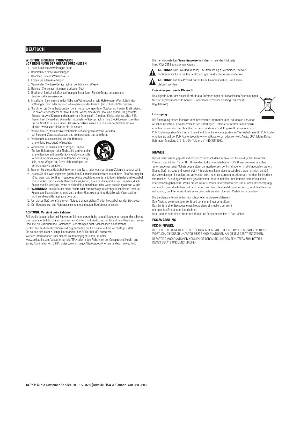 ACHTUNG: Vorsicht beim Zuhören! Polk Audio-Lautsprecher und Subwoofer können extrem hohe Lautstärkepegel erzeugen, die schwere oder permanente Hörschäden verursachen könnten. Polk Audio, Inc. ist für auf den Missbrauch seiner Produkte zurückzuführende Hörschäden, Verletzungen oder Sachschäden nicht haftbar. Denken Sie an diese Richtlinien und begrenzen Sie die Lautstärke auf ein vernünftiges Maß: Sie sollten sich nicht zu lange Lautstärken über 85 Dezibel (dB) aussetzen. Weitere Informationen über sichere Lautstärkepegel finden Sie unter www.polkaudio.com/education/article/SPL/ oder in den Richtlinien der Occupational Health and Safety Administration (OSHA) unter www.osha.gov/dts/osta/otm/noise/standards_more.html. Die hier dargestellten Warnhinweise befinden sich auf der Rückseite Ihres PSWi225 Lautsprechersystems. ACHTUNG: (Nur USA und Kanada) Um Stromschlag zu vermeiden, Stecker mit breiter Klinke in breiten Schlitz und ganz in die Steckdose einstecken. ACHTUNG: Auf dem Produkt dürfen keine Flammenquellen, wie Kerzen, platziert werden. Emissionsgrenzwerte Klasse B Das digitale Gerät der Klasse B erfüllt alle Anforderungen der kanadischen Bestimmungen für störungsverursachende Geräte („Canadian Interference-Causing Equipment Regulations“). Entsorgung Die Entsorgung dieses Produkts kann bestimmten internation-alen, nationalen und/oder örtlichen Gesetzen und/oder Vorschriften unterliegen. Detaillierte Informationen hierzu erhalten Sie von dem Fachhändler, bei dem Sie dieses Produkt gekauft haben, oder vom Polk Audio-Importeur/Vertrieb in Ihrem Land. Eine Liste von Importeuren/ Vertriebsfirmen für Polk Audio erhalten Sie auf der Polk Audio-Website www.polkaudio.com oder von Polk Audio, 5601 Metro Drive, Baltimore, Maryland 21215, USA–Telefon: +1 410 358-3600. HINWEIS: Dieses Gerät wurde geprüft und entspricht demnach den Grenzwerten für ein digitales Gerät der Klasse B gemäß Teil 15 der Richtlinien der US-Fernmeldebehörde (FCC). Diese Grenzwerte sollen einen angemessenen Schutz gegen störende Interferenzen bei Installationen in Wohngebieten bieten. Dieses Gerät erzeugt und verwendet HF-Energie und kann diese ausstrahlen; wenn es nicht gemäß den Anweisungen installiert und verwendet wird, kann es störende Interferenzen mit dem Funkverkehr verursachen. Allerdings wird nicht gewährleistet, dass es bei einer bestimmten Installation keine Interferenzen geben wird. Wenn dieses Gerät störende Interferenzen zum Radio- und Fernsehempfang verursacht, (was durch Aus- und Einschalten des Geräts festgestellt werden kann), wird dem Benutzer nahegelegt, die Interferenz durch eines oder mehrere der folgenden Verfahren zu beheben: Die Empfangsantenne anders ausrichten oder anderswo platzieren. Den Abstand zwischen dem Gerät und dem Empfänger vergrößern. Das Gerät in eine Steckdose eines Netzkreises einstecken, der nicht mit dem des Empfängers identisch ist. Den Händler oder einen erfahrenen Radio-und Fernsehtechniker zu Rate ziehen. FCC-WARNUNG FCC-HINWEIS: DER HERSTELLER IST NICHT FÜR STÖRUNGEN DES RADIO- ODER FERNSEHEMPFANGS VERANT- WORTLICH, DIE DURCH UNAUTORISIERTE MODIFIKATIONEN AN DIESEM GERÄT ENTSTEHEN. DERARTIGE MODIFIKATIONEN KÖNNEN DIE BERECHTIGUNG DES BENUTZERS ZUM BETRIEB DIESES GERÄTS UNGÜLTIG MACHEN. DEUTSCH 14 Polk Audio Customer Service 800-377-7655 (Outside USA & Canada: 410-358-3600)ERSTE SCHRITTE Vorsicht: Subwoofer sind schwer. Seien Sie beim Auspacken Ihres Subwoofers vorsichtig. Prüfen Sie, dass sich alles im Karton des drahtlosen Subwoofers Polk Audio PSWi225 befindet. Sie sollten Folgendes vorfinden: Inhalt