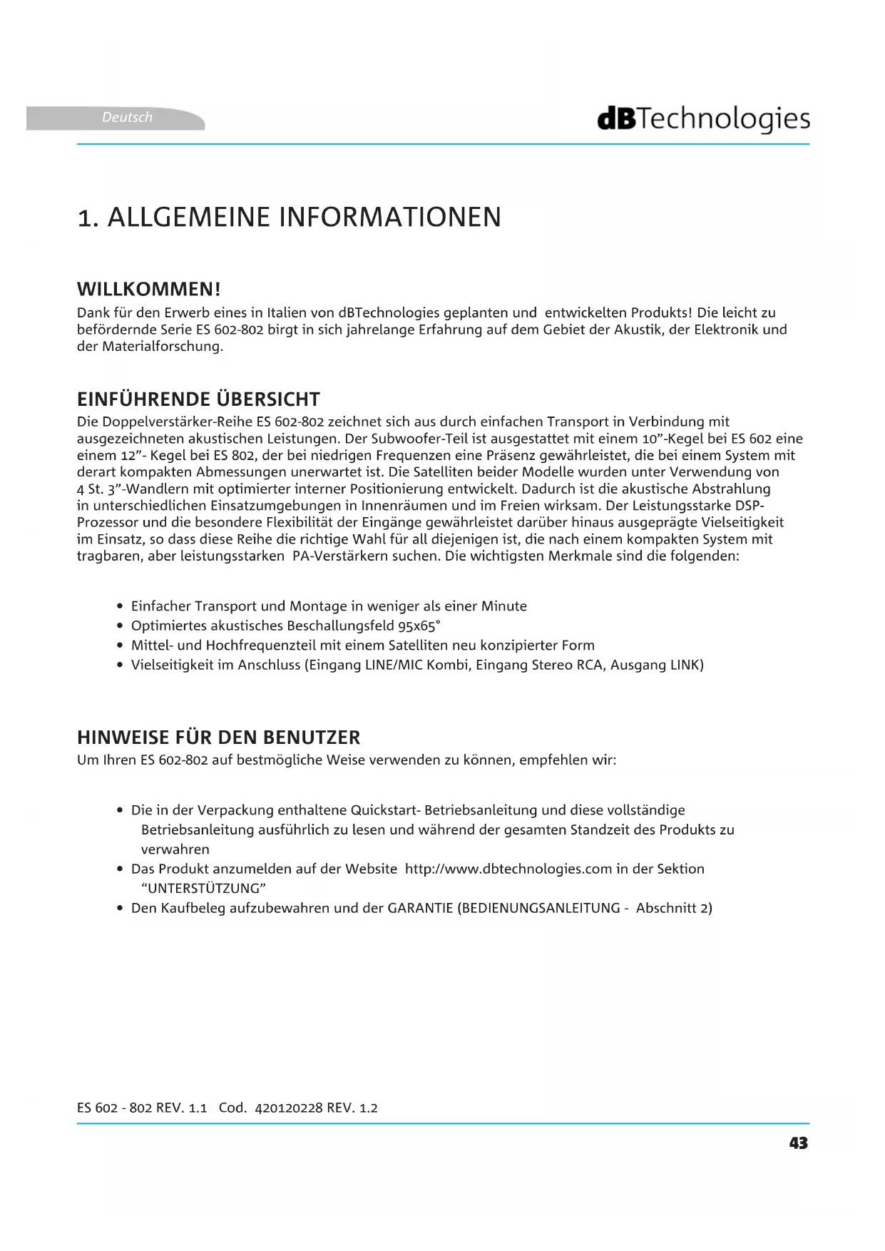 ALLGEMEINES AKUSTISCHE DATEN VERSTÄRKER Typ Aktives 2-Wege-System bestehend aus zwei Full-Range-Satelliten und Subwoofer Frequenzgang [-10dB]: 37 - 15000 Hz Max SPL: 124 dB MF-HF: 8x3” Typ MF- HF: Neodym Crossover-Frequenz: 206 Hz Richtwinkel (HxV): 95°x65° LF: 12” Typ: Digipro® G3 Verstärkerklasse: Klasse D Verstärkerleistung (Power Amp - Peak): 1200 W Versorgung: SMPS mit PSU Auto-range Versorgungsstecker: VDE- Buchse Kühltechnik: Konvektion Kontrollen: 1 Preset- Drehschalter, 1 Anzeige-Led für Anstehen des Audio- Eingangssignals Anlaufüberstroms: 20,26 A Deutsch59 ES 602 - 802 REV. 1.1 Cod. 420120228 REV. 1.2 PROZESSOR EINGÄNGE ABMESSUNGEN Interner Controller: DSP 24 bit/48 kHz Einstellungen des Systems: Wählbare Voreinstellungen Limiter: Dual active, Peak, RMS, ermo Eingänge: 1x Kombi (XLR/Jack) symmetrisch/unsymmetrisch + 1 Stereo- Eingang RCA Ausgänge: 1x XLR link OUT symmetrisch Subwoofer-Gehäuse: Sperrholz Stärke 15 mm Satelliten-Gehäuse: Polypropylen PP Grie 2, seitlich (am Subwoofer) Montage auf Stange: 2 mitgelieferte Stangen Durchmesser 25 mm mit Gewinde M20, davon eine teleskopisch Breite Satellit: 95 mm (3,74 inch.) Höhe Satellit: 360 mm (13,98 inch.) Tiefe Satellit: 430 mm (16,9 inch.) Breite Subwoofer: 300 mm (13,8 inch.) Höhe Subwoofer: 400 mm (15,7 inch.) Tiefe Subwoofer: 430 mm (16,9 inch.) Gewicht Satellit: 1,9 kg (4,19 lbs.) Gewicht Subwoofer: 16,4 kg (36,16 lbs) Deutsch60 ES 602 - 802 Cod. 420120228 REV. 1.2 Eigenschaften, Spezikationen und Aussehen der Produkte können ohne Ankündigung geändert werden. dBTechnologies behält sich das Recht vor, Änderungen oder Verbesserungen der Eigenschaften oder Herstellung des Produkts vorzunehmen, ohne verpichtet zu sein, die vorher hergestellten Produkte auf den gleichen Stand zu bringen. A.E.B. Industriale Srl Via Brodolini, 8 Località Crespellano 40053 VALSAMOGGIA BOLOGNA (ITALIA) Tel +39 051 969870 Fax +39 051 969725 www.dbtechnologies.com info@dbtechnologies-aeb.com Deutsch61 ES 602 - 802 REV. 1.1 Cod. 420120228 REV. 1.2 RÉSUMÉ 1. INFORMATIONS GÉNÉRALES ................................................................................................62 BIENVENUE ! .......................................................................................................................62