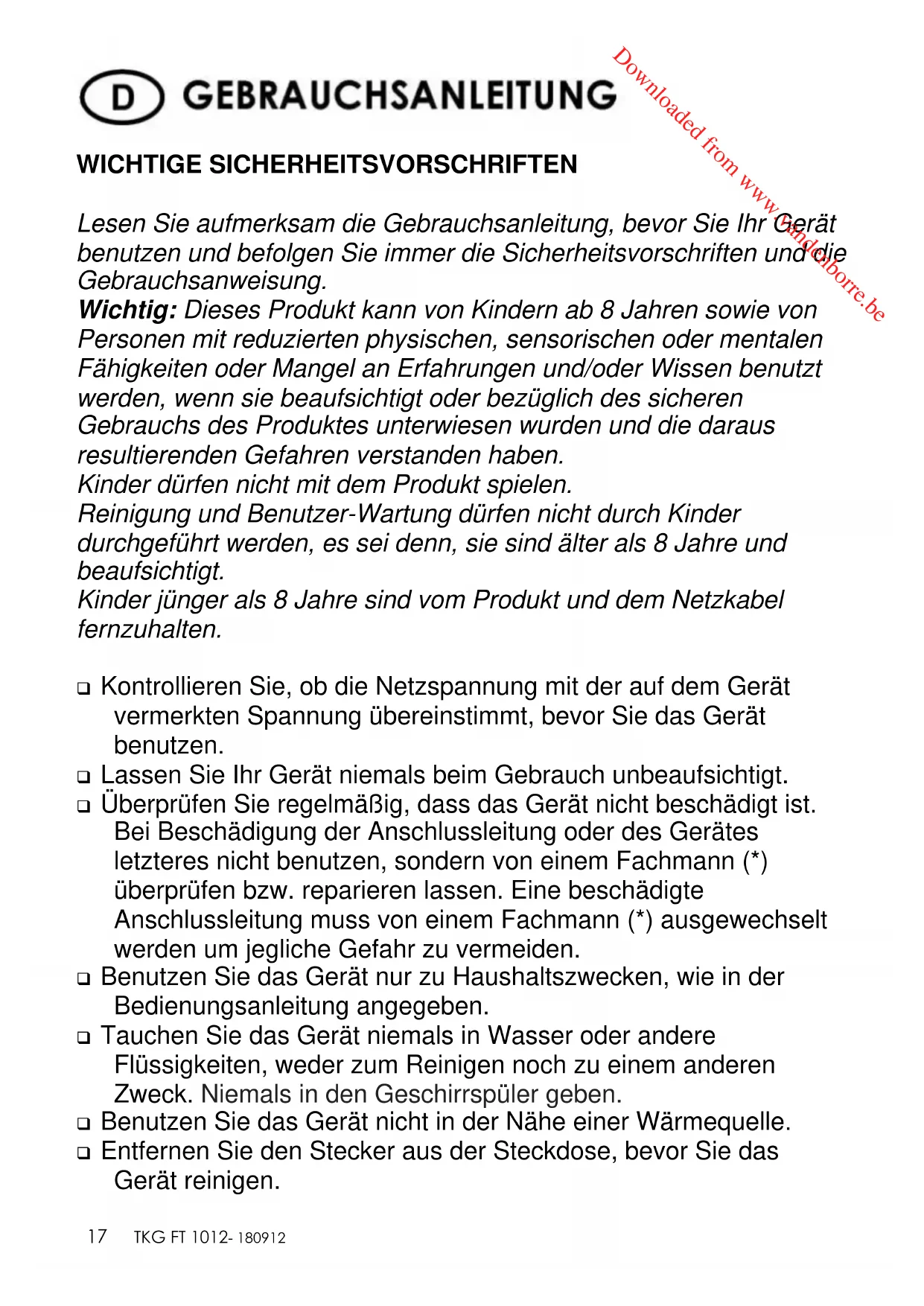 WICHTIGE SICHERHEITSVORSCHRIFTEN Lesen Sie aufmerksam die Gebrauchsanleitung, bevor Sie Ihr Gerät benutzen und befolgen Sie immer die Sicherheitsvorschriften und die Gebrauchsanweisung. Wichtig: Dieses Produkt kann von Kindern ab 8 Jahren sowie von Personen mit reduzierten physischen, sensorischen oder mentalen Fähigkeiten oder Mangel an Erfahrungen und/oder Wissen benutzt werden, wenn sie beaufsichtigt oder bezüglich des sicheren Gebrauchs des Produktes unterwiesen wurden und die daraus resultierenden Gefahren verstanden haben. Kinder dürfen nicht mit dem Produkt spielen. Reinigung und Benutzer-Wartung dürfen nicht durch Kinder durchgeführt werden, es sei denn, sie sind älter als 8 Jahre und beaufsichtigt. Kinder jünger als 8 Jahre sind vom Produkt und dem Netzkabel fernzuhalten. ❑ Kontrollieren Sie, ob die Netzspannung mit der auf dem Gerät vermerkten Spannung übereinstimmt, bevor Sie das Gerät benutzen. ❑ Lassen Sie Ihr Gerät niemals beim Gebrauch unbeaufsichtigt. ❑ Überprüfen Sie regelmäßig, dass das Gerät nicht beschädigt ist. Bei Beschädigung der Anschlussleitung oder des Gerätes letzteres nicht benutzen, sondern von einem Fachmann (*) überprüfen bzw. reparieren lassen. Eine beschädigte Anschlussleitung muss von einem Fachmann (*) ausgewechselt werden um jegliche Gefahr zu vermeiden. ❑ Benutzen Sie das Gerät nur zu Haushaltszwecken, wie in der Bedienungsanleitung angegeben. ❑ Tauchen Sie das Gerät niemals in Wasser oder andere Flüssigkeiten, weder zum Reinigen noch zu einem anderen Zweck. Niemals in den Geschirrspüler geben. ❑ Benutzen Sie das Gerät nicht in der Nähe einer Wärmequelle. ❑ Entfernen Sie den Stecker aus der Steckdose, bevor Sie das Gerät reinigen. Downloaded from www.vandenborre.beCopies of the I/B. Please reproduce them without any changes except under special instruction from Team International BELGIUM. The pages must be reproduced and folded in order to obtain a booklet A5 (+/- 148.5 mm width x 210 mm height). When folding, make sure you keep the good numbering when you turn the pages of the I/B. Don’t change the page numbering. Keep the language integrity.