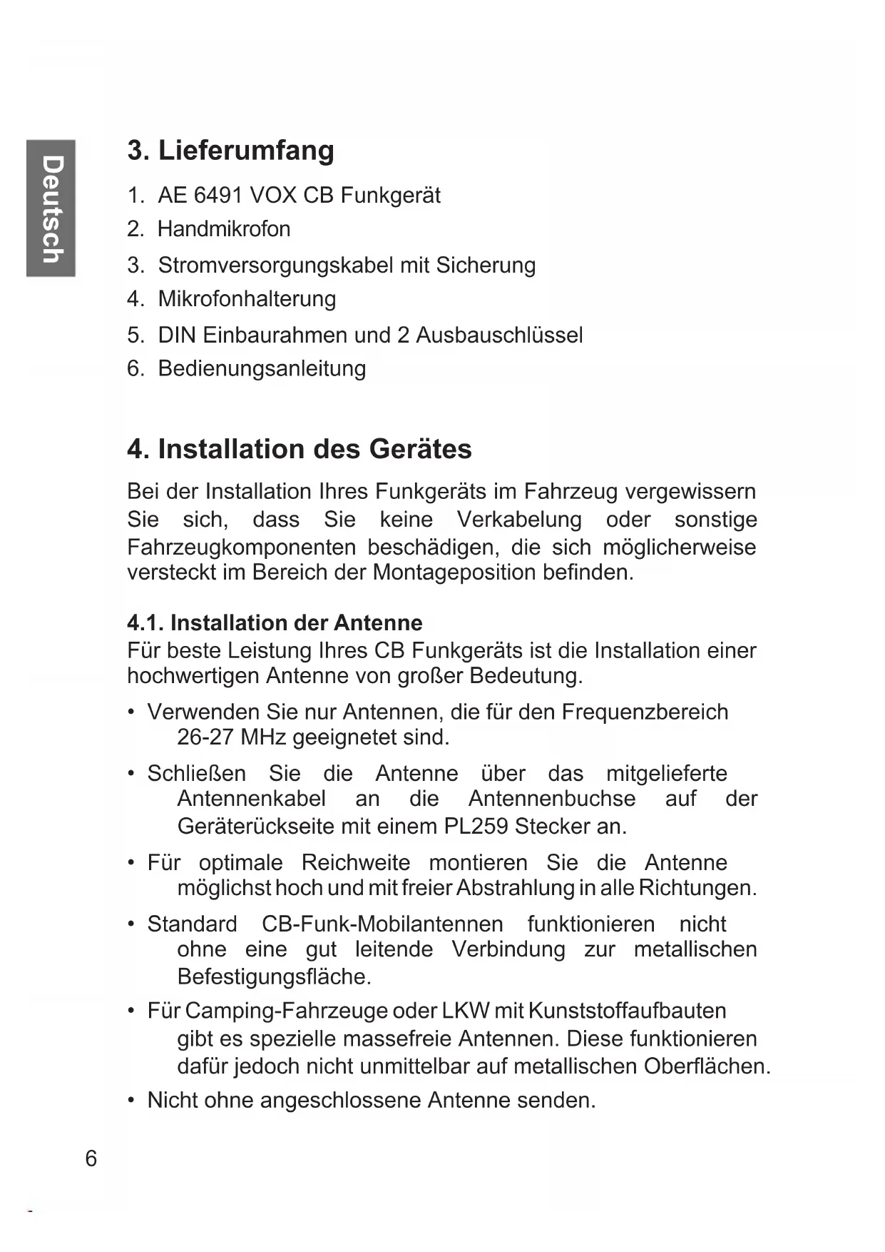CB Funkgerät AE 6491 VOX CB radio AE 6491 VOX Bedienungsanleitung / Manual Deutsch / English / Français / Italiano2 Deutsch Inhaltsverzeichnis