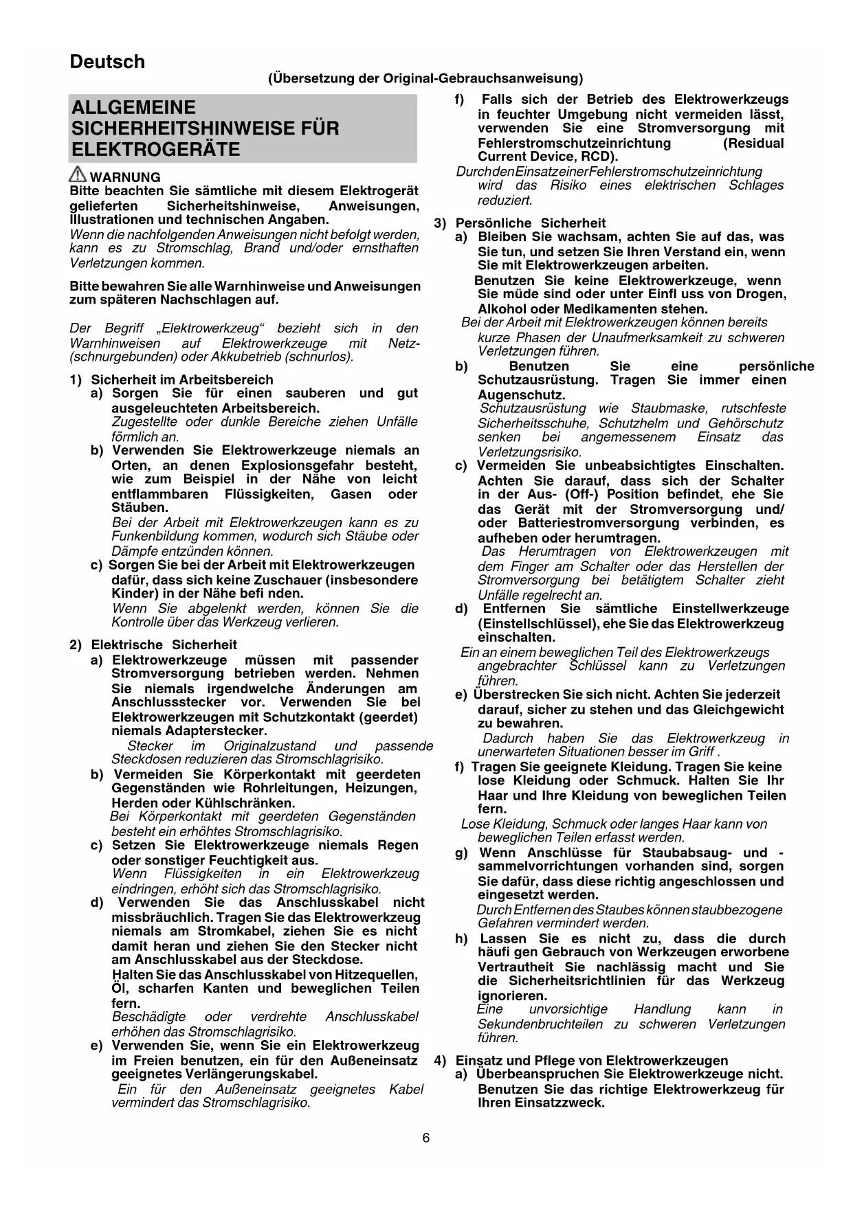 ELEKTROGERÄTE WARNUNG Bitte beachten Sie sämtliche mit diesem Elektrogerät gelieferten Sicherheitshinweise, Anweisungen, Illustrationen und technischen Angaben. Wenn die nachfolgenden Anweisungen nicht befolgt werden, kann es zu Stromschlag, Brand und/oder ernsthaften Verletzungen kommen. Bitte bewahren Sie alle Warnhinweise und Anweisungen zum späteren Nachschlagen auf. Der Begriff „Elektrowerkzeug“ bezieht sich in den Warnhinweisen auf Elektrowerkzeuge mit Netz- (schnurgebunden) oder Akkubetrieb (schnurlos).
