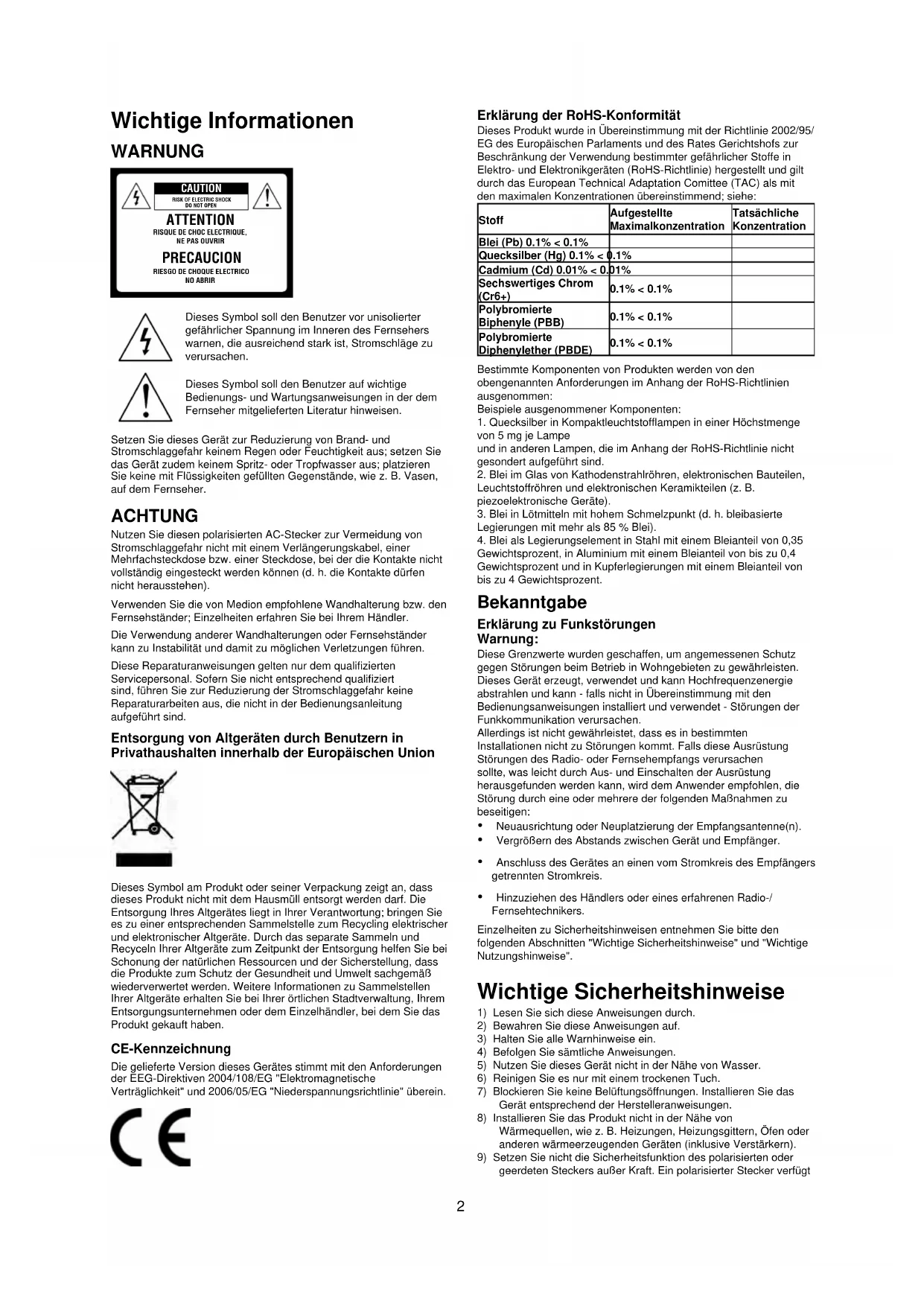 ATTENTION RISQUE DE CHOC ELECTRIQUE, NE PAS OUVRIR PRECAUCION RIESGO DE CHOQUE ELECTRICONO ABRIRDieses Symbol soll den Benutzer vor unisolierter gefährlicher Spannung im Inneren des Fernsehers warnen, die ausreichend stark ist, Stromschläge zu verursachen.Dieses Symbol soll den Benutzer auf wichtige Bedienungs- und Wartungsanweisungen in der dem Fernseher mitgelieferten Literatur hinweisen.Setzen Sie dieses Gerät zur Reduzierung von Brand- und Stromschlaggefahr keinem Regen oder Feuchtigkeit aus; setzen Sie das Gerät zudem keinem Spritz- oder Tropfwasser aus; platzieren Sie keine mit Flüssigkeiten gefüllten Gegenstände, wie z. B. Vasen, auf dem Fernseher. ACHTUNG Nutzen Sie diesen polarisierten AC-Stecker zur Vermeidung von Stromschlaggefahr nicht mit einem Verlängerungskabel, einer Mehrfachsteckdose bzw. einer Steckdose, bei der die Kontakte nicht vollständig eingesteckt werden können (d. h. die Kontakte dürfen nicht herausstehen).Verwenden Sie die von Medion empfohlene Wandhalterung bzw. den Fernsehständer; Einzelheiten erfahren Sie bei Ihrem Händler.Die Verwendung anderer Wandhalterungen oder Fernsehständer kann zu Instabilität und damit zu möglichen Verletzungen führen.Diese Reparaturanweisungen gelten nur dem qualifizierten Servicepersonal. Sofern Sie nicht entsprechend qualifiziert sind, führen Sie zur Reduzierung der Stromschlaggefahr keine Reparaturarbeiten aus, die nicht in der Bedienungsanleitung aufgeführt sind. Entsorgung von Altgeräten durch Benutzern in Privathaushalten innerhalb der Europäischen Union Dieses Symbol am Produkt oder seiner Verpackung zeigt an, dass dieses Produkt nicht mit dem Hausmüll entsorgt werden darf. Die Entsorgung Ihres Altgerätes liegt in Ihrer Verantwortung; bringen Sie es zu einer entsprechenden Sammelstelle zum Recycling elektrischer und elektronischer Altgeräte. Durch das separate Sammeln und Recyceln Ihrer Altgeräte zum Zeitpunkt der Entsorgung helfen Sie bei Schonung der natürlichen Ressourcen und der Sicherstellung, dass die Produkte zum Schutz der Gesundheit und Umwelt sachgemäß wiederverwertet werden. Weitere Informationen zu Sammelstellen Ihrer Altgeräte erhalten Sie bei Ihrer örtlichen Stadtverwaltung, Ihrem Entsorgungsunternehmen oder dem Einzelhändler, bei dem Sie das Produkt gekauft haben. CE-Kennzeichnung Die gelieferte Version dieses Gerätes stimmt mit den Anforderungen der EEG-Direktiven 2004/108/EG "Elektromagnetische Verträglichkeit" und 2006/05/EG "Niederspannungsrichtlinie" überein. Erklärung der RoHS-Konformität Dieses Produkt wurde in Übereinstimmung mit der Richtlinie 2002/95/EG des Europäischen Parlaments und des Rates Gerichtshofs zur Beschränkung der Verwendung bestimmter gefährlicher Stoffe inElektro- und Elektronikgeräten (RoHS-Richtlinie) hergestellt und gilt durch das European Technical Adaptation Comittee (TAC) als mit den maximalen Konzentrationen übereinstimmend; siehe:StoffAufgestellte MaximalkonzentrationTatsächliche KonzentrationBlei (Pb) 0.1% < 0.1%Quecksilber (Hg) 0.1% < 0.1%Cadmium (Cd) 0.01% < 0.01%Sechswertiges Chrom (Cr6+)0.1% < 0.1%Polybromierte Biphenyle (PBB)0.1% < 0.1%Polybromierte Diphenylether (PBDE)0.1% < 0.1%Bestimmte Komponenten von Produkten werden von den obengenannten Anforderungen im Anhang der RoHS-Richtlinien ausgenommen:Beispiele ausgenommener Komponenten:1. Quecksilber in Kompaktleuchtstofflampen in einer Höchstmenge von 5 mg je Lampeund in anderen Lampen, die im Anhang der RoHS-Richtlinie nicht gesondert aufgeführt sind.2. Blei im Glas von Kathodenstrahlröhren, elektronischen Bauteilen, Leuchtstoffröhren und elektronischen Keramikteilen (z. B. piezoelektronische Geräte).3. Blei in Lötmitteln mit hohem Schmelzpunkt (d. h. bleibasierte Legierungen mit mehr als 85 % Blei).4. Blei als Legierungselement in Stahl mit einem Bleianteil von 0,35 Gewichtsprozent, in Aluminium mit einem Bleianteil von bis zu 0,4 Gewichtsprozent und in Kupferlegierungen mit einem Bleianteil von bis zu 4 Gewichtsprozent. Bekanntgabe Erklärung zu Funkstörungen Warnung: Diese Grenzwerte wurden geschaffen, um angemessenen Schutz gegen Störungen beim Betrieb in Wohngebieten zu gewährleisten. Dieses Gerät erzeugt, verwendet und kann Hochfrequenzenergie abstrahlen und kann - falls nicht in Übereinstimmung mit den Bedienungsanweisungen installiert und verwendet - Störungen der Funkkommunikation verursachen.Allerdings ist nicht gewährleistet, dass es in bestimmten Installationen nicht zu Störungen kommt. Falls diese Ausrüstung Störungen des Radio- oder Fernsehempfangs verursachen sollte, was leicht durch Aus- und Einschalten der Ausrüstung herausgefunden werden kann, wird dem Anwender empfohlen, die Störung durch eine oder mehrere der folgenden Maßnahmen zu beseitigen: Neuausrichtung oder Neuplatzierung der Empfangsantenne(n). Vergrößern des Abstands zwischen Gerät und Empfänger. Anschluss des Gerätes an einen vom Stromkreis des Empfängers getrennten Stromkreis. Hinzuziehen des Händlers oder eines erfahrenen Radio-/ Fernsehtechnikers.Einzelheiten zu Sicherheitshinweisen entnehmen Sie bitte den folgenden Abschnitten "Wichtige Sicherheitshinweise" und "Wichtige Nutzungshinweise". Wichtige Sicherheitshinweise 1) Lesen Sie sich diese Anweisungen durch.2) Bewahren Sie diese Anweisungen auf.3) Halten Sie alle Warnhinweise ein.4) Befolgen Sie sämtliche Anweisungen.5) Nutzen Sie dieses Gerät nicht in der Nähe von Wasser.6) Reinigen Sie es nur mit einem trockenen Tuch.7) Blockieren Sie keine Belüftungsöffnungen. Installieren Sie das Gerät entsprechend der Herstelleranweisungen.8) Installieren Sie das Produkt nicht in der Nähe von Wärmequellen, wie z. B. Heizungen, Heizungsgittern, Öfen oder anderen wärmeerzeugenden Geräten (inklusive Verstärkern).9) Setzen Sie nicht die Sicherheitsfunktion des polarisierten oder geerdeten Steckers außer Kraft. Ein polarisierter Stecker verfügt3 über zwei Kontakte, von denen einer breiter ist als der andere. Ein geerdet