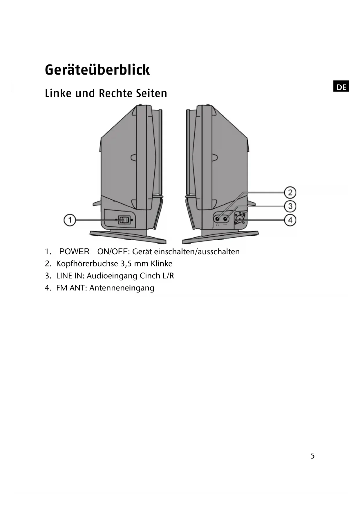 Vorbereitung Lieferumfang prüfen ACHTUNG! Halten Sie Verpackungen von Kindern fern. Es besteht Erstickungsgefahr Vergewissern Sie sich beim Auspacken, dass folgende Teile mitgeliefert wurden: Micro-Audio-System Fernbedienung UKW-Antenne Diese Bedienungsanleitung und Garantiekarte Batterie in die Fernbedienung einlegen Im Auslieferzustand ist die Batterie bereits in der Fernbedienung eingelegt. Ziehen Sie zum Aktivieren den Isolationsstreifen mit der Aufschrift „PLEASE REMOVE IT BEFORE USE“ an der Unterseite der Fernbedienung heraus. Batterie wechseln Die Fernbedienung benötigt eine Knopfzellen-Batterie 3 V, CR2032. WARNUNG! Explosionsgefahr bei unsachgemäßem Auswechseln der Batterien. Ersatz nur durch denselben oder einen gleichwertigen Batterietyp. Drücken Sie auf die Verriegelung und ziehen Sie das Batteriefach heraus. Entnehmen Sie die leere Batterie und entsorgen Sie diese bei einer Sammelstelle für Altbatterien. Legen Sie die neue Batterie vom Typ CR 2032 mit dem Pluspol nach oben in das Fach ein. Achten Sie unbedingt auf die richtige Polarität (+/-). Schieben Sie das Fach wieder ein16 Aufstellung und Anschlüsse Gerät aufstellen Stellen Sie die Geräte auf eine ebene, feste Oberfläche. Beachten Sie hierzu auch die Sicherheitshinweise auf Seite 9. Einige aggressive Möbellacke können die Gummifüße der Geräte angreifen. Stellen Sie das Gerät ggf. auf eine Unterlage. ACHTUNG! Wenn Sie Anschlüsse an ein externes Gerät vornehmen, ziehen Sie vorher die Netzstecker aller Geräte ab! Standfuss anbringen Wenn Sie das Gerät aufstellen wollen, verwenden Sie den mitgelieferten Standfuß. Setzen Sie das Gerät mit den 4 Haken in die entsprechenden Kerben am Standfuß und schieben Sie das Gerät dann auf den Standfuß, bis es einrastet. Um den Standfuß wieder abzunehmen, schieben Sie den Standfuß in Richtung Geräterückseite und ziehen Sie ihn dann ab. Wandmontage Sie können das Hauptgerät an einer Wand befestigen. Dazu müssen Sie zwei Schrauben in der Wand befestigen, deren Köpfe in die Schlüssellöcher auf der Rückseite passen. ACHTUNG! Vergewissern Sie sich, dass keine Strom- oder Versorgungsleitungen in der Wand verlaufen, bevor Sie die Löcher für die Montage bohren. Markieren Sie die zu bohrenden Löcher. Abstand der Bohrlöcher für das Gerät: 160 mm. Bohren Sie in diese Markierungen 2 Löcher für 6-mm Dübel.17