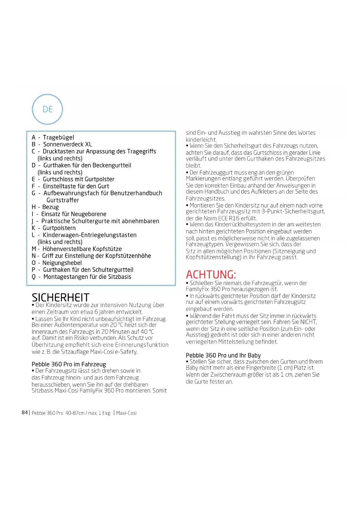 A - Tragebügel B - Sonnenverdeck XL C - Drucktasten zur Anpassung des Tragegris (links und rechts) D - Gurthaken für den Beckengurtteil (links und rechts) E - Gurtschloss mit Gurtpolster F - Einstelltaste für den Gurt G - Auewahrungsfach für Benutzerhandbuch Gurtstraer H - Bezug I - Einsatz für Neugeborene J - Praktische Schultergurte mit abnehmbaren K - Gurtpolstern L - Kinderwagen-Entriegelungstasten (links und rechts) M - Höhenverstellbare Kopfstütze N - Gri zur Einstellung der Kopfstützenhöhe O - Neigungshebel P - Gurthaken für den Schultergurtteil Q - Montagestangen für die Sitzbasis85