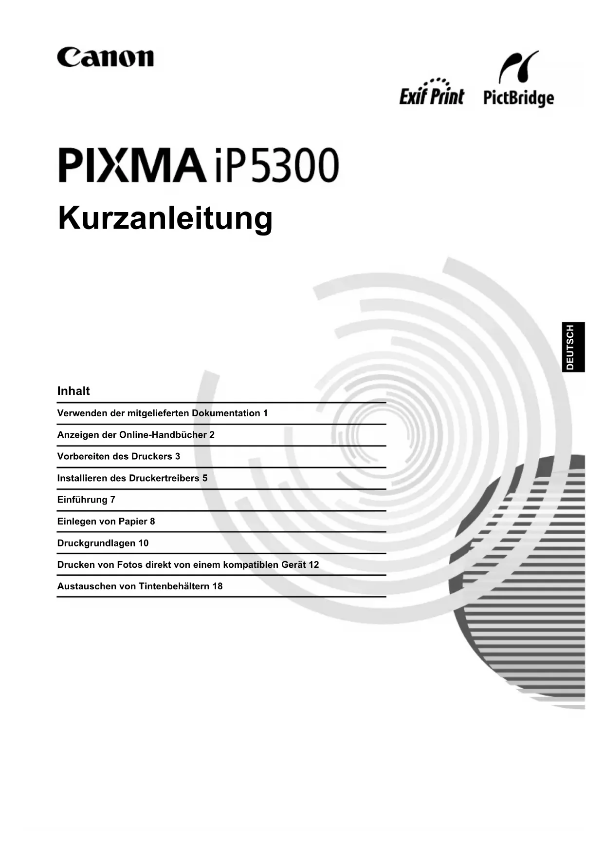 -Programm für Bürogeräte handelt es sich um ein weltweites Programm zur Strom sparenden Nutzung von Computern und Bürogeräten. Das Programm widmet sich der Entwicklung und Verbreitung von Produkten, die einen Beitrag zu geringerem Energieverbrauch leisten. Es handelt sich um ein offenes System. Die Teilnahme ist freiwillig. Kernstück des Programms sind Bürogeräte wie Computer, Monitore, Drucker, Faxgeräte und Kopierer. In den teilnehmenden Ländern werden jeweils einheitliche Standards und Logos verwendet. Anforderungen an die Stromversorgung Verwenden Sie ausschließlich die Netzspannung, die in dem Land verwendet wird, in dem das Gerät gekauft wurde. Die Verwendung einer falschen Spannung kann zu einem Brand oder elektrischen Schlag führen. Die folgende Liste zeigt die jeweils gültigen Stromspannungen und Frequenzen: 100 bis 240 V, 50/60 Hz Informationen zu Verbrauchsmaterialien Verbrauchsmaterialien (Tintenbehälter/FINE-Tintenpatronen (FINE Cartridges)) sind bis zu 5 Jahre nach Einstellung ihrer Herstellung erhältlich. Sicherheitsvorkehrungen Modellnummer: K10285 (iP5300) Warnhinweis z Fassen Sie den Netzstecker nie mit nassen Händen an. z Achten Sie darauf, dass Sie das Netzkabel nicht beschädigen, verändern, ziehen oder übermäßig biegen oder verdrehen. Stellen Sie keine schweren Gegenstände auf das Netzkabel. Verwenden Sie ausschließlich die Stromspannung, die für das Land gültig ist, in dem das Gerät erworben wurde. Die Verwendung einer falschen Spannung und Frequenz kann zu einem Brand oder elektrischen Schlag führen.z Stecken Sie den Stecker immer vollständig in die Steckdose. Vorsicht z Bewahren Sie Tintenbehälter aus Sicherheitsgründen außerhalb der Reichweite von Kleinkindern auf. z Achten Sie darauf, dass die Tintenbehälter nicht herunterfallen oder geschüttelt werden, da Tinte austreten und Kleidung und Hände verschmutzen kann. Lesen Sie auch die Sicherheitsvorkehrungen im Online-Handbuch des Benutzerhandbuchs. Beachten Sie die Warnhinweise und Vorsichtsmaßnahmen, um Verletzungen oder Beschädigungen des Druckers zu vermeiden.1Verwenden der mitgelieferten Dokumentation DEUTSCH Verwenden der mitgelieferten Dokumentation Einfache Installationsanleitung (Installationsinformationen) Lesen Sie zuerst diese Installationsinformationen. Sie enthalten Anweisungen, mit denen Sie Ihren Drucker einrichten und für seine Verwendung vorbereiten können. Kurzanleitung (Dieses Handbuch) Lesen Sie dieses Handbuch, wenn Sie den Drucker das erste Mal verwenden. Nachdem Sie die Anweisungen im Handbuch Einfache Installationsanleitung (Installationsinformationen) befolgt haben, empfiehlt es sich, diese Kurzanleitung zu lesen. So können Sie sich mit den Grundlagen vertraut machen, z. B. dem Drucken von Ihrem Computer oder einem PictBridge- kompatiblen Gerät. Online-Handbücher Benutzerhandbuch Lesen Sie dieses Handbuch, wenn Sie den Drucker das erste Mal verwenden. Wenn Sie in der Kurzanleitung nicht genügend Informationen finden, verwenden Sie das Benutzerhandbuch, das Sie über die [Setup CD-ROM/ Installations-CD-ROM] installieren können. Dieses Handbuch enthält ausführliche Anweisungen zu folgenden Themen: z Drucken vom Computer z Geeignete Medientypen z Regelmäßige Wartung z Fehlerbehebung Für erweiterte Funktionen stehen außerdem zusätzliche Handbücher zur Verfügung. Druckertreiberhandbuch In diesem Handbuch finden Sie ausführliche Anweisungen zu den Druckertreibereinstellungen. [Photo Application Guide/Handbuch zu Fotoanwendungen] In diesem Handbuch finden Sie Anweisungen zur Verwendung der Anwendungssoftware, die auf der [Setup CD-ROM/Installations-CD-ROM] enthalten ist.2 Anzeigen der Online-Handbücher DEUTSCH Anzeigen der Online-Handbücher Neben dieser Kurzanleitung sind auch Online-Handbücher im Lieferumfang des Druckers enthalten. Ausführliche Informationen zum Installieren der Online-Handbücher finden Sie im Handbuch Einfache Installationsanleitung (Installationsinformationen). Führen Sie folgende Schritte durch, um die Online-Handbücher anzuzeigen: Doppelklicken Sie zum Anzeigen des Online-Handbuchs auf das Symbol [iP5300 On-screen Manual/iP5300-Online-Handbuch] auf dem Desktop, oder wählen Sie [Start] > [All Programs/ Alle Programme] (bzw. [Programs/Programme])> [Canon iP5300 Manual/Canon iP5300- Handbuch] und anschließend [iP5300 On-screen Manual/iP5300-Online-Handbuch]. Systemanforderungen Browser: Windows HTML Help Viewer Zum Anzeigen des Online-Handbuchs doppelklicken Sie auf dem Schreibtisch auf das Verknüpfungssymbol [iP5300 On-screen Manual/iP5300-Online-Handbuch]. Systemanforderungen Browser: Help Viewer Hinweis z Microsoft Internet Explorer