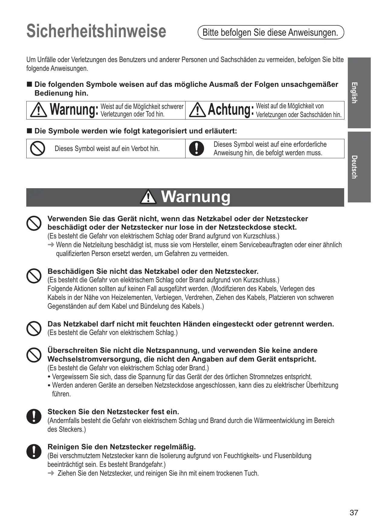 Cause Action 01 appears on the display. There has been a power failure for a certain amount of time (differs depending on the circumstances - e.g. mains power failure, unplugging, malfunctioning fuse or breaker). Remove the dough and start again using new ingredients. H01–H02 appears on the display. The display indicates a problem with the Bread Maker. Consult the place of purchase or a Panasonic service centre. U50 appears on the display. The unit is hot (above 40°C/105°F). This may occur with repeated use. Allow the unit to cool down to below 40°C/105°F before using it again (U50 will disappear). Sicherheitshinweise Bitte befolgen Sie diese Anweisungen. Um Unfälle oder Verletzungen des Benutzers und anderer Personen und Sachschäden zu vermeiden, befolgen Sie bitte folgende Anweisungen. auf die Möglichkeit schwerer Warnung: Weist Verletzungen oder Tod hin. auf die Möglichkeit von Achtung: Weist Verletzungen oder Sachschäden hin. English Die folgenden Symbole weisen auf das mögliche Ausmaß der Folgen unsachgemäßer Bedienung hin. Die Symbole werden wie folgt kategorisiert und erläutert: Dieses Symbol weist auf ein Verbot hin. Deutsch Dieses Symbol weist auf eine erforderliche Anweisung hin, die befolgt werden muss. Warnung Verwenden Sie das Gerät nicht, wenn das Netzkabel oder der Netzstecker beschädigt oder der Netzstecker nur lose in der Netzsteckdose steckt. (Es besteht die Gefahr von elektrischem Schlag oder Brand aufgrund von Kurzschluss.) Wenn die Netzleitung beschädigt ist, muss sie vom Hersteller, einem Servicebeauftragten oder einer ähnlich qualifizierten Person ersetzt werden, um Gefahren zu vermeiden. Beschädigen Sie nicht das Netzkabel oder den Netzstecker. (Es besteht die Gefahr von elektrischem Schlag oder Brand aufgrund von Kurzschluss.) Folgende Aktionen sollten auf keinen Fall ausgeführt werden. (Modifizieren des Kabels, Verlegen des Kabels in der Nähe von Heizelementen, Verbiegen, Verdrehen, Ziehen des Kabels, Platzieren von schweren Gegenständen auf dem Kabel und Bündelung des Kabels.) Das Netzkabel darf nicht mit feuchten Händen eingesteckt oder getrennt werden. (Es besteht die Gefahr von elektrischem Schlag.) Überschreiten Sie nicht die Netzspannung, und verwenden Sie keine andere Wechselstromversorgung, die nicht den Angaben auf dem Gerät entspricht. (Es besteht die Gefahr von elektrischem Schlag oder Brand.) ● Vergewissern Sie sich, dass die Spannung für das Gerät der des örtlichen Stromnetzes entspricht. ● Werden anderen Geräte an derselben Netzsteckdose angeschlossen, kann dies zu elektrischer Überhitzung führen. Stecken Sie den Netzstecker fest ein. (Andernfalls besteht die Gefahr von elektrischem Schlag und Brand durch die Wärmeentwicklung im Bereich des Steckers.) Reinigen Sie den Netzstecker regelmäßig. (Bei verschmutztem Netzstecker kann die Isolierung aufgrund von Feuchtigkeits- und Flusenbildung beeinträchtigt sein. Es besteht Brandgefahr.) Ziehen Sie den Netzstecker, und reinigen Sie ihn mit einem trockenen Tuch.