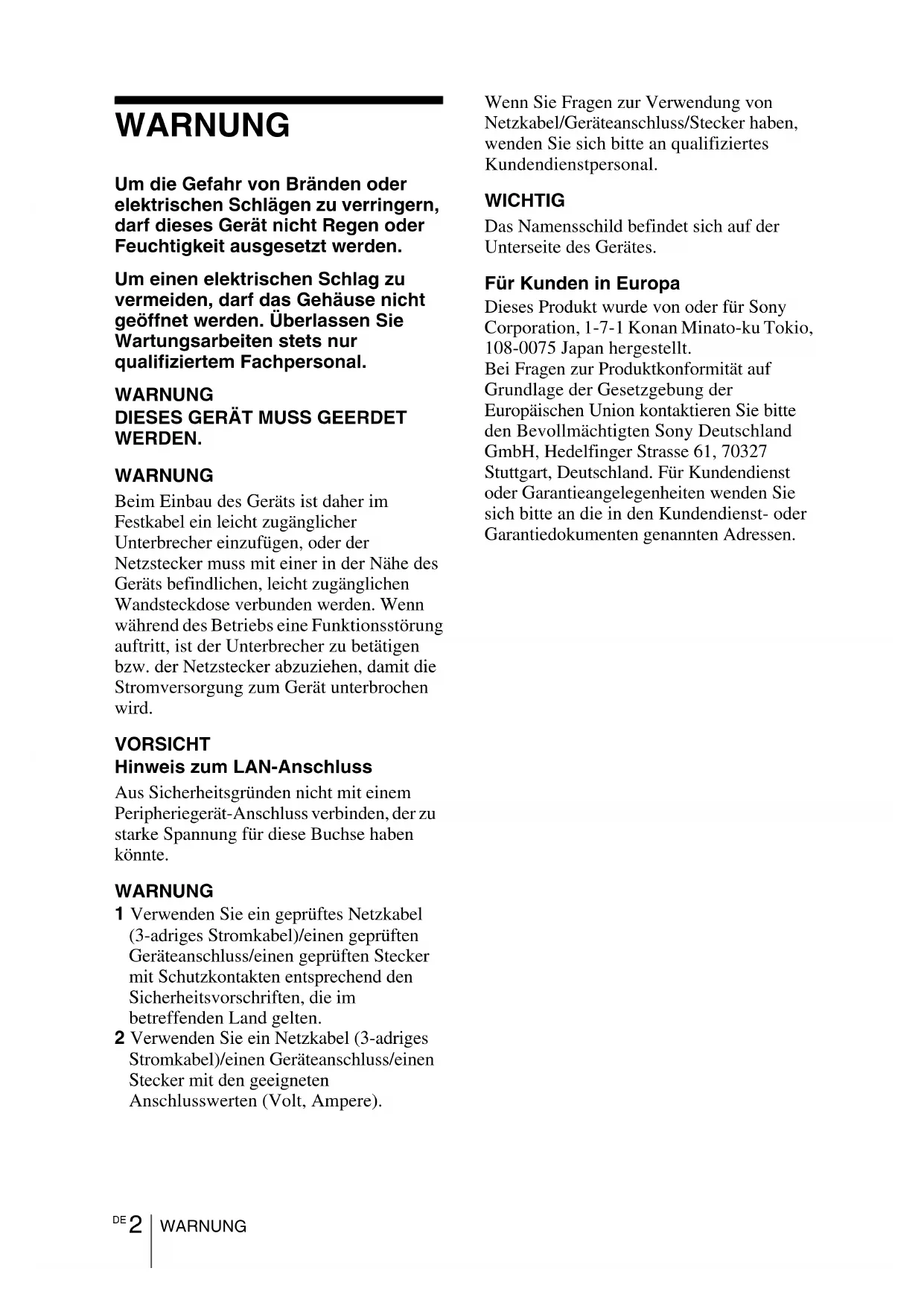 WERDEN. WARNUNG Beim Einbau des Geräts ist daher im Festkabel ein leicht zugänglicher Unterbrecher einzufügen, oder der Netzstecker muss mit einer in der Nähe des Geräts befindlichen, leicht zugänglichen Wandsteckdose verbunden werden. Wenn während des Betriebs eine Funktionsstörung auftritt, ist der Unterbrecher zu betätigen bzw. der Netzstecker abzuziehen, damit die Stromversorgung zum Gerät unterbrochen wird. VORSICHT Hinweis zum LAN-Anschluss Aus Sicherheitsgründen nicht mit einem Peripheriegerät-Anschluss verbinden, der zu starke Spannung für diese Buchse haben könnte. WARNUNG 1 Verwenden Sie ein geprüftes Netzkabel (3-adriges Stromkabel)/einen geprüften Geräteanschluss/einen geprüften Stecker mit Schutzkontakten entsprechend den Sicherheitsvorschriften, die im betreffenden Land gelten. 2 Verwenden Sie ein Netzkabel (3-adriges Stromkabel)/einen Geräteanschluss/einen Stecker mit den geeigneten Anschlusswerten (Volt, Ampere). Wenn Sie Fragen zur Verwendung von Netzkabel/Geräteanschluss/Stecker haben, wenden Sie sich bitte an qualifiziertes Kundendienstpersonal. WICHTIG Das Namensschild befindet sich auf der Unterseite des Gerätes. Für Kunden in Europa Dieses Produkt wurde von oder für Sony Corporation, 1-7-1 Konan Minato-ku Tokio, 108-0075 Japan hergestellt. Bei Fragen zur Produktkonformität auf Grundlage der Gesetzgebung der Europäischen Union kontaktieren Sie bitte den Bevollmächtigten Sony Deutschland GmbH, Hedelfinger Strasse 61, 70327 Stuttgart, Deutschland. Für Kundendienst oder Garantieangelegenheiten wenden Sie sich bitte an die in den Kundendienst- oder Garantiedokumenten genannten Adressen.3