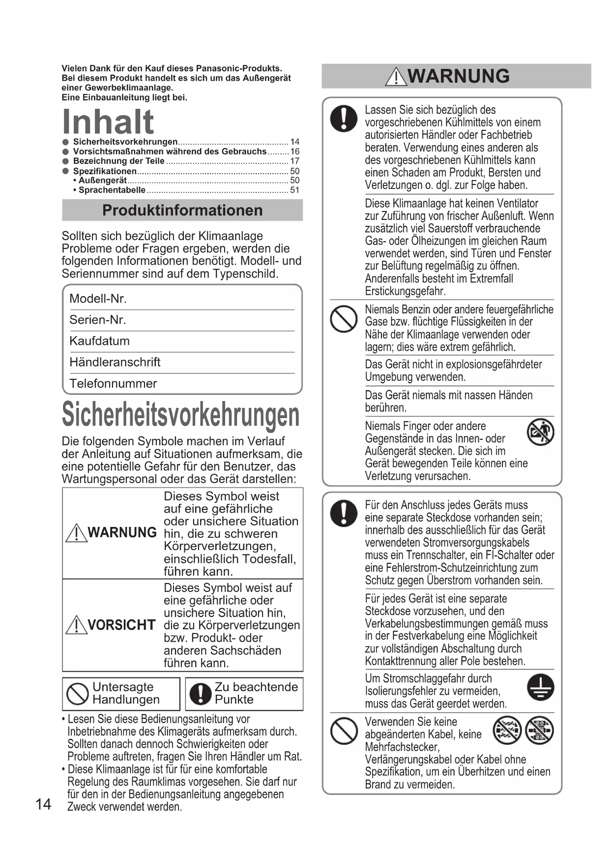 - Sprachentabelle ........................................................... 51 Inhalt Sicherheitsvorkehrungen Produktinformationen Sollten sich bezüglich der Klimaanlage Probleme oder Fragen ergeben, werden die folgenden Informationen benötigt. Modell- und Seriennummer sind auf dem Typenschild. Modell-Nr. Serien-Nr. Kaufdatum Händleranschrift Telefonnummer Lassen Sie sich bezüglich des vorgeschriebenen Kühlmittels von einem autorisierten Händler oder Fachbetrieb beraten. Verwendung eines anderen als des vorgeschriebenen Kühlmittels kann einen Schaden am Produkt, Bersten und Verletzungen o. dgl. zur Folge haben. Diese Klimaanlage hat keinen Ventilator zur Zuführung von frischer Außenluft. Wenn zusätzlich viel Sauerstoff verbrauchende Gas- oder Ölheizungen im gleichen Raum verwendet werden, sind Türen und Fenster zur Belüftung regelmäßig zu öffnen. Anderenfalls besteht im Extremfall Erstickungsgefahr. Niemals Benzin oder andere feuergefährliche Gase bzw. üchtige Flüssigkeiten in der Nähe der Klimaanlage verwenden oder lagern; dies wäre extrem gefährlich. Das Gerät nicht in explosionsgefährdeter Umgebung verwenden. Das Gerät niemals mit nassen Händen berühren. Niemals Finger oder andere Gegenstände in das Innen- oder Außengerät stecken. Die sich im Gerät bewegenden Teile können eine Verletzung verursachen. Die folgenden Symbole machen im Verlauf der Anleitung auf Situationen aufmerksam, die eine potentielle Gefahr für den Benutzer, das Wartungspersonal oder das Gerät darstellen: WARNUNG Dieses Symbol weist auf eine gefährliche oder unsichere Situation hin, die zu schweren Körperverletzungen, einschließlich Todesfall, führen kann. VORSI CHT Dieses Symbol weist auf eine gefährliche oder unsichere Situation hin, die zu Körperverletzungen bzw. Produkt- oder anderen Sachschäden führen kann. Untersagte Handlungen Zu beachtende Punkte Vielen Dank für den Kauf dieses Panasonic-Produkts.Bei diesem Produkt handelt es sich um das Außengerät einer Gewerbeklimaanlage.Eine Einbauanleitung liegt bei.
