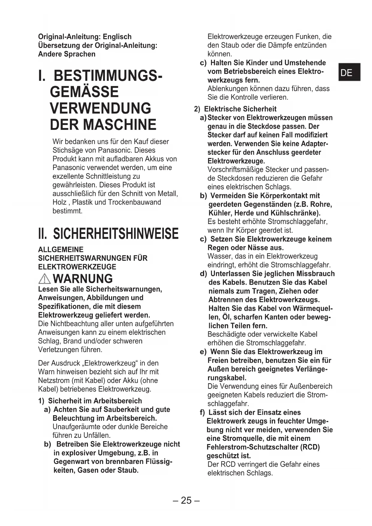 GEMÄSSE VERWENDUNG DER MASCHINE Wir bedanken uns für den Kauf dieser Stichsäge von Panasonic. Dieses Produkt kann mit auadbaren Akkus von Panasonic verwendet werden, um eine exzellente Schnittleistung zu gewährleisten. Dieses Produkt ist ausschließlich für den Schnitt von Metall, Holz , Plastik und Trockenbauwand bestimmt.