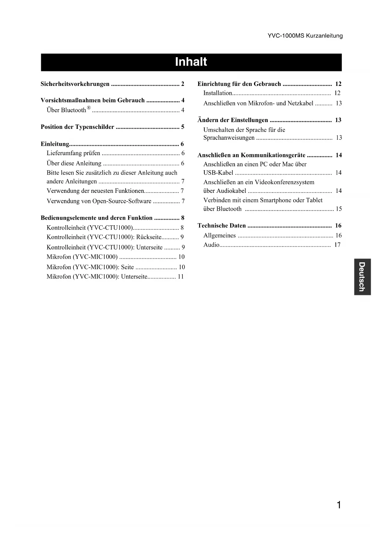 (*1) Unterstützte Versionen finden Sie auf der folgenden Webseite: https://uc.yamaha.com/ Technische Daten Allgemeines Schnittstelle: Kontrolleinheit: USB 2.0 High Speed, Bluetooth, NFC (Near Field Communication), Audioeingangsanschlüsse (Stereo-Cinch-Buchse), Audioausgangsanschlüsse (Stereo-Cinch- Buchse), Anschluss für externe Lautsprecher (Cinch-Buchse) x 2, Netzanschluss, Mikrofonanschluss Mikrofon: Ein- und Ausgangsanschluss Leistungsaufnahme (max.): 20 W (bei einem angeschlossenen Mikrofon), 35 W (bei fünf angeschlossenen Mikrofonen) Betriebsumgebung: Temperatur: 0 bis 40 °C (32 bis 104 °F) Luftfeuchtigkeit: 20 bis 85 % (keine Kondensation) Lagerungsumgebung: Temperatur: -20 bis +50 °C (-4 bis 122 °F) Luftfeuchtigkeit: 10 bis 90 % (keine Kondensation) Abmessungen: Kontrolleinheit (B x H x T): 332 x 95 x 162 mm (13,1 x 3,74 x 6,38") Mikrofon (B x H x T): 136 x 36 x 136 mm (5,35 x 1,42 x 5,35") Gewicht: Kontrolleinheit: 1,8 kg (4,0 lbs) Mikrofon: 0,4 kg (0,9 lbs) Stromversorgung: Modelle für die USA und Kanada: AC 120 V (60 Hz) Modell für Japan: AC 100 V (50/60Hz) Modell für China: AC 220 V (50 Hz) Modell für Korea: AC 110/220 V (60 Hz) Modelle für UK, Europa und Russland: AC 220-240 V (50 Hz) PC/Mac-Umgebung: Betriebssystem: Windows (*1), macOS (*1) USB: USB 2.0 oder höher Bluetooth: Bluetooth-Spezifikationsversion: 2.1 + EDR Unterstütze Profile: HFP (1.6), A2DP Unterstützte Codecs: SBC, mSBC, CVSD Wireless-Ausgang: Klasse 2 Maximaler Übertragungsweg: 10 m Funkfrequenz (Betriebsfrequenz): 2.402 MHz bis 2.480 MHz Maximale Ausgangsleistung (EIRP): 4,0 dBm (2,5 mW) NFC: Kompatible Geräte: NFC-kompatible Android-Geräte Funkfrequenz (Betriebsfrequenz): 13,56 MHz Sprachanweisungen: Englisch, Japanisch, Chinesisch, Koreanisch, Französisch, Spanisch, Deutsch Zubehör: Netzkabel (3 m), USB-Kabel (5 m), Mikrofonkabel (5 m), Kurzanleitung Sonstiges: Firmware-Update (Übertragung vom PC über USB)YVC-1000MS Kurzanleitung