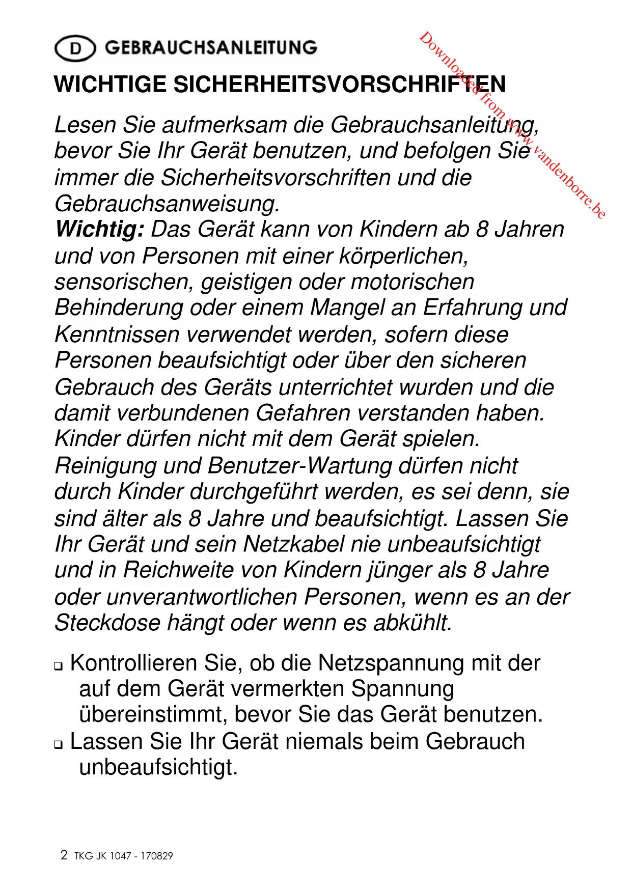 Fax +32 2 359 95 50 Überprüfen Sie regelmäßig, dass das Gerät nicht beschädigt ist. Bei Beschädigung der Anschlussleitung oder des Gerätes, letzteres nicht benutzen, sondern von einem Fachmann(*) überprüfen bzw. reparieren lassen. Eine beschädigte Anschlussleitung muss von einem Fachmann(*) ausgewechselt werden, damit jede Gefahr gemieden wird. Benutzen Sie das Gerät nur zu Haushaltszwecken, wie in der Bedienungsanleitung angegeben. Tauchen Sie das Gerät niemals in Wasser oder andere Flüssigkeiten, weder zum Reinigen, noch zu einem anderen Zweck. Geben Sie das Gerät niemals in die Spülmaschine. Benutzen Sie das Gerät nicht in der Nähe einer Wärmequelle. Lassen Sie den Wasserkocher abkühlen und ziehen Sie den Stecker aus der Steckdose bevor Sie das Gerät reinigen oder aufräumen. Benutzen Sie das Gerät nicht im Freien und bewahren Sie es an einem trockenen Platz auf. Benutzen Sie nur Zubehör, welches vom Lieferanten empfohlen wurde. Anderes Zubehör stellt eine Gefahr für den Benutzer dar und das Gerät könnte dadurch beschädigt werden. Ziehen Sie niemals an der Anschlussleitung um das Gerät zu bewegen. Achten Sie darauf, dass die Anschlussleitung nicht irgendwo hängen Downloaded from www.vandenborre.be Copies of the I/B. Please reproduce them without any changes except under special instruction from Team International BELGIUM. The pages must be reproduced and folded in order to obtain a booklet A5 (+/- 148.5 mm width x 210 mm height). When folding, make sure you keep the good numbering when you turn the pages of the I/B. Don’t change the page numbering. Keep the language integrity.