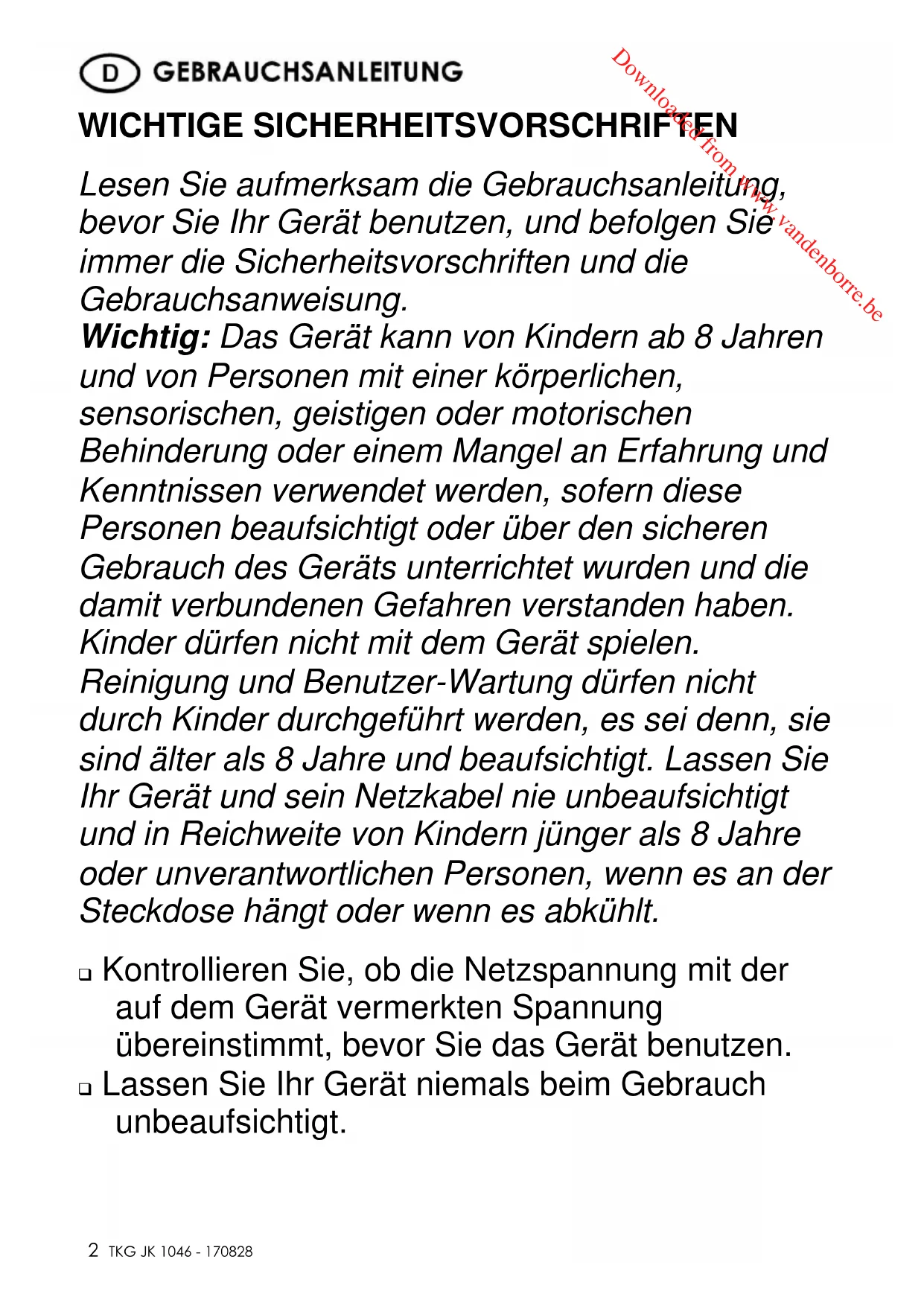 Fax +32 2 359 95 50 Überprüfen Sie regelmäßig, dass das Gerät nicht beschädigt ist. Bei Beschädigung der Anschlussleitung oder des Gerätes, letzteres nicht benutzen, sondern von einem Fachmann(*) überprüfen bzw. reparieren lassen. Eine beschädigte Anschlussleitung muss von einem Fachmann(*) ausgewechselt werden, damit jede Gefahr gemieden wird. Benutzen Sie das Gerät nur zu Haushaltszwecken, wie in der Bedienungsanleitung angegeben. Tauchen Sie das Gerät niemals in Wasser oder andere Flüssigkeiten, weder zum Reinigen, noch zu einem anderen Zweck. Geben Sie das Gerät niemals in die Spülmaschine. Benutzen Sie das Gerät nicht in der Nähe einer Wärmequelle. Lassen Sie den Wasserkocher abkühlen und ziehen Sie den Stecker aus der Steckdose bevor Sie das Gerät reinigen oder aufräumen. Benutzen Sie das Gerät nicht im Freien und bewahren Sie es an einem trockenen Platz auf. Benutzen Sie nur Zubehör, welches vom Lieferanten empfohlen wurde. Anderes Zubehör stellt eine Gefahr für den Benutzer dar und das Gerät könnte dadurch beschädigt werden. Ziehen Sie niemals an der Anschlussleitung um das Gerät zu bewegen. Achten Sie darauf, dass die Anschlussleitung nicht irgendwo hängen Downloaded from www.vandenborre.be Copies of the I/B. Please reproduce them without any changes except under special instruction from Team International BELGIUM. The pages must be reproduced and folded in order to obtain a booklet A5 (+/- 148.5 mm width x 210 mm height). When folding, make sure you keep the good numbering when you turn the pages of the I/B. Don’t change the page numbering. Keep the language integrity.