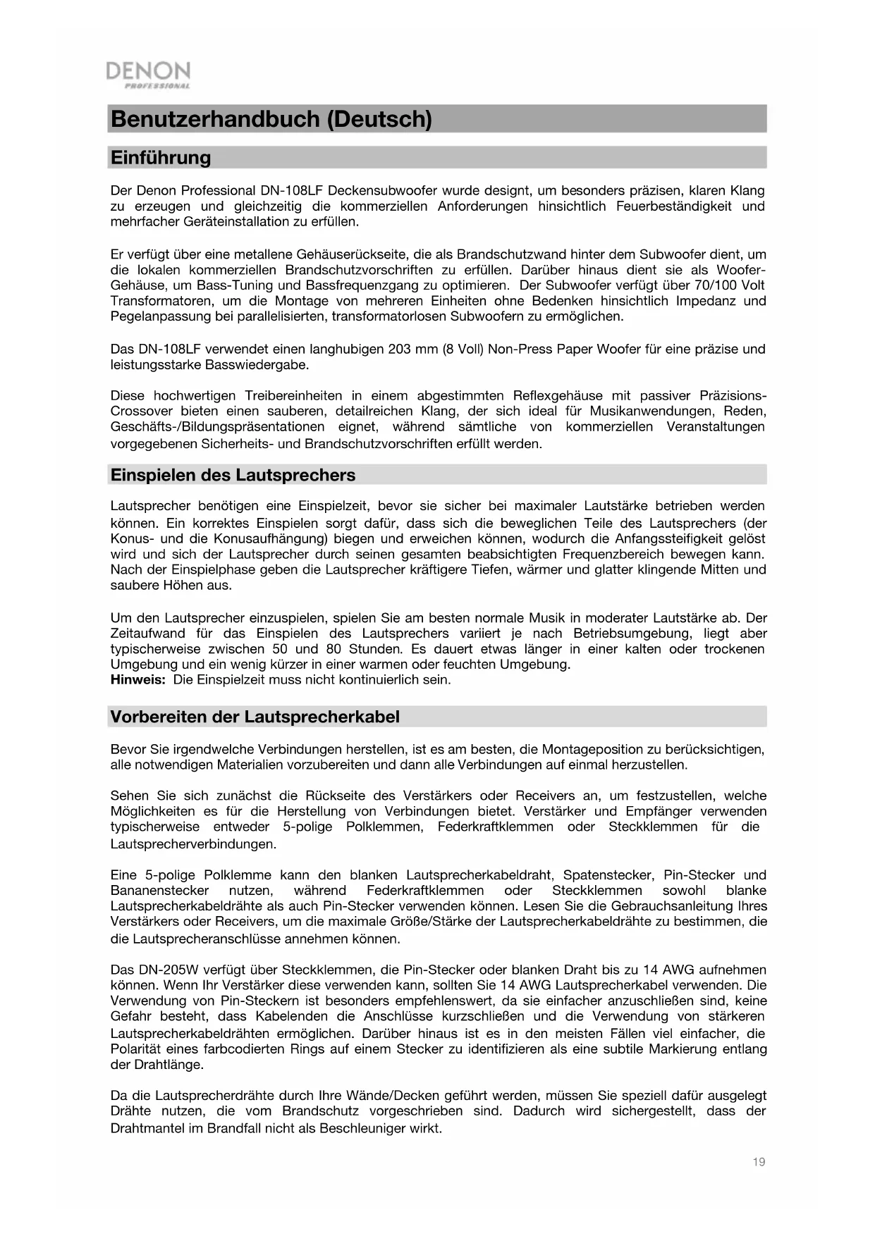Benutzerhandbuch (Deutsch) Einführung Der Denon Professional DN-108LF Deckensubwoofer wurde designt, um besonders präzisen, klaren Klang zu erzeugen und gleichzeitig die kommerziellen Anforderungen hinsichtlich Feuerbeständigkeit und mehrfacher Geräteinstallation zu erfüllen. Er verfügt über eine metallene Gehäuserückseite, die als Brandschutzwand hinter dem Subwoofer dient, um die lokalen kommerziellen Brandschutzvorschriften zu erfüllen. Darüber hinaus dient sie als Woofer- Gehäuse, um Bass-Tuning und Bassfrequenzgang zu optimieren. Der Subwoofer verfügt über 70/100 Volt Transformatoren, um die Montage von mehreren Einheiten ohne Bedenken hinsichtlich Impedanz und Pegelanpassung bei parallelisierten, transformatorlosen Subwoofern zu ermöglichen. Das DN-108LF verwendet einen langhubigen 203 mm (8 Voll) Non-Press Paper Woofer für eine präzise und leistungsstarke Basswiedergabe. Diese hochwertigen Treibereinheiten in einem abgestimmten Reflexgehäuse mit passiver Präzisions- Crossover bieten einen sauberen, detailreichen Klang, der sich ideal für Musikanwendungen, Reden, Geschäfts-/Bildungspräsentationen eignet, während sämtliche von kommerziellen Veranstaltungen vorgegebenen Sicherheits- und Brandschutzvorschriften erfüllt werden. Einspielen des Lautsprechers Lautsprecher benötigen eine Einspielzeit, bevor sie sicher bei maximaler Lautstärke betrieben werden können. Ein korrektes Einspielen sorgt dafür, dass sich die beweglichen Teile des Lautsprechers (der Konus- und die Konusaufhängung) biegen und erweichen können, wodurch die Anfangssteifigkeit gelöst wird und sich der Lautsprecher durch seinen gesamten beabsichtigten Frequenzbereich bewegen kann. Nach der Einspielphase geben die Lautsprecher kräftigere Tiefen, wärmer und glatter klingende Mitten und saubere Höhen aus. Um den Lautsprecher einzuspielen, spielen Sie am besten normale Musik in moderater Lautstärke ab. Der Zeitaufwand für das Einspielen des Lautsprechers variiert je nach Betriebsumgebung, liegt aber typischerweise zwischen 50 und 80 Stunden. Es dauert etwas länger in einer kalten oder trockenen Umgebung und ein wenig kürzer in einer warmen oder feuchten Umgebung. Hinweis: Die Einspielzeit muss nicht kontinuierlich sein. Vorbereiten der Lautsprecherkabel Bevor Sie irgendwelche Verbindungen herstellen, ist es am besten, die Montageposition zu berücksichtigen, alle notwendigen Materialien vorzubereiten und dann alle Verbindungen auf einmal herzustellen. Sehen Sie sich zunächst die Rückseite des Verstärkers oder Receivers an, um festzustellen, welche Möglichkeiten es für die Herstellung von Verbindungen bietet. Verstärker und Empfänger verwenden typischerweise entweder 5-polige Polklemmen, Federkraftklemmen oder Steckklemmen für die Lautsprecherverbindungen. Eine 5-polige Polklemme kann den blanken Lautsprecherkabeldraht, Spatenstecker, Pin-Stecker und Bananenstecker nutzen, während Federkraftklemmen oder Steckklemmen sowohl blanke Lautsprecherkabeldrähte als auch Pin-Stecker verwenden können. Lesen Sie die Gebrauchsanleitung Ihres Verstärkers oder Receivers, um die maximale Größe/Stärke der Lautsprecherkabeldrähte zu bestimmen, die die Lautsprecheranschlüsse annehmen können. Das DN-205W verfügt über Steckklemmen, die Pin-Stecker oder blanken Draht bis zu 14 AWG aufnehmen können. Wenn Ihr Verstärker diese verwenden kann, sollten Sie 14 AWG Lautsprecherkabel verwenden. Die Verwendung von Pin-Steckern ist besonders empfehlenswert, da sie einfacher anzuschließen sind, keine Gefahr besteht, dass Kabelenden die Anschlüsse kurzschließen und die Verwendung von stärkeren Lautsprecherkabeldrähten ermöglichen. Darüber hinaus ist es in den meisten Fällen viel einfacher, die Polarität eines farbcodierten Rings auf einem Stecker zu identifizieren als eine subtile Markierung entlang der Drahtlänge. Da die Lautsprecherdrähte durch Ihre Wände/Decken geführt werden, müssen Sie speziell dafür ausgelegt Drähte nutzen, die vom Brandschutz vorgeschrieben sind. Dadurch wird sichergestellt, dass der Drahtmantel im Brandfall nicht als Beschleuniger wirkt.20