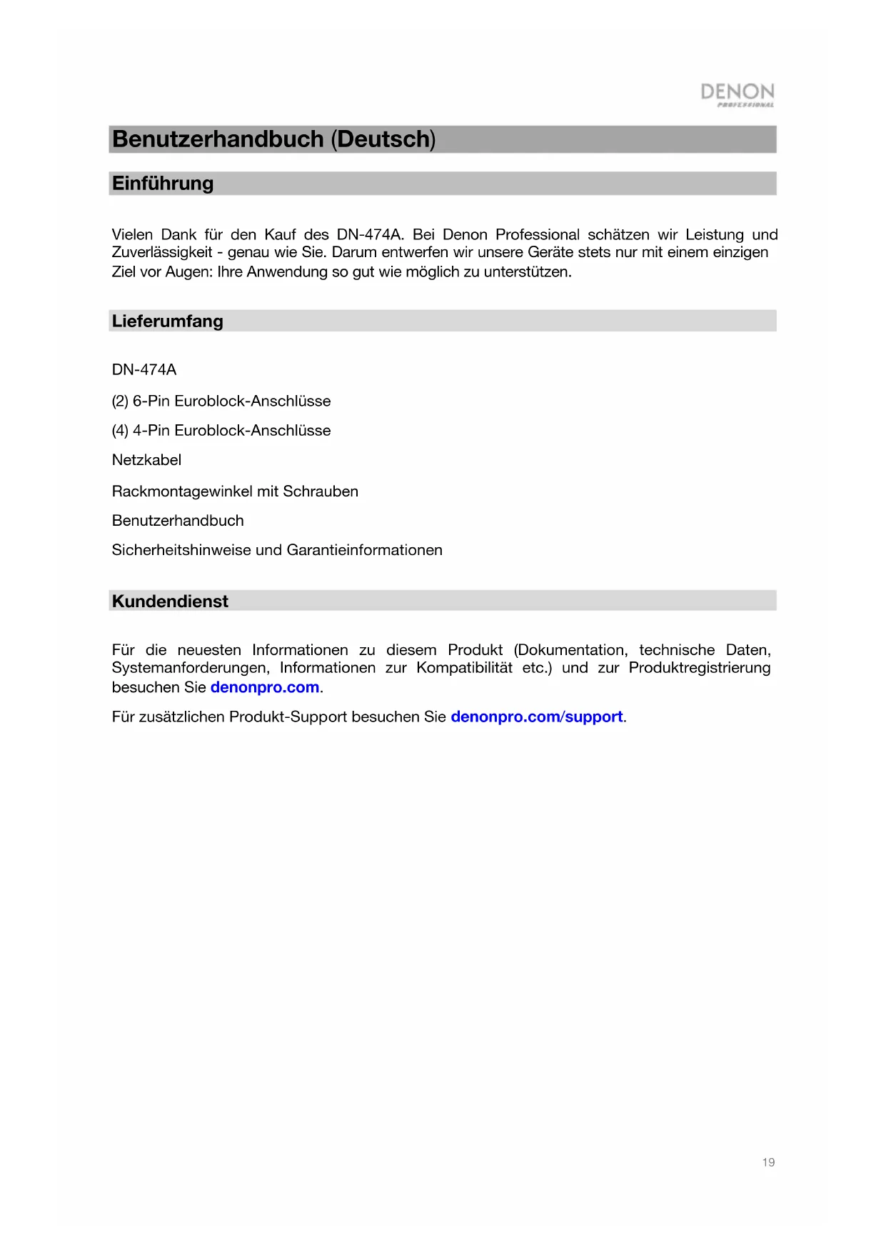 Il suono presenta ronzio o rumore. Verificare le polarità delle connessioni di ingresso. Se viene utilizzata una connessione non bilanciata, assicurarsi che il terminale (-) sia collegato a GND. Se il LED clip è acceso, ridurre il volume di uscita. Verificare le polarità delle connessioni dell’altoparlante. Installazione CH A CH B CH C CH D19 Benutzerhandbuch (Deutsch) Einführung Vielen Dank für den Kauf des DN-474A. Bei Denon Professional schätzen wir Leistung und Zuverlässigkeit - genau wie Sie. Darum entwerfen wir unsere Geräte stets nur mit einem einzigen Ziel vor Augen: Ihre Anwendung so gut wie möglich zu unterstützen. Lieferumfang DN-474A (2) 6-Pin Euroblock-Anschlüsse (4) 4-Pin Euroblock-Anschlüsse Netzkabel Rackmontagewinkel mit Schrauben Benutzerhandbuch Sicherheitshinweise und Garantieinformationen Kundendienst Für die neuesten Informationen zu diesem Produkt (Dokumentation, technische Daten, Systemanforderungen, Informationen zur Kompatibilität etc.) und zur Produktregistrierung besuchen Sie denonpro.com. Für zusätzlichen Produkt-Support besuchen Sie denonpro.com/support.20 Funktionen Vorderseite
