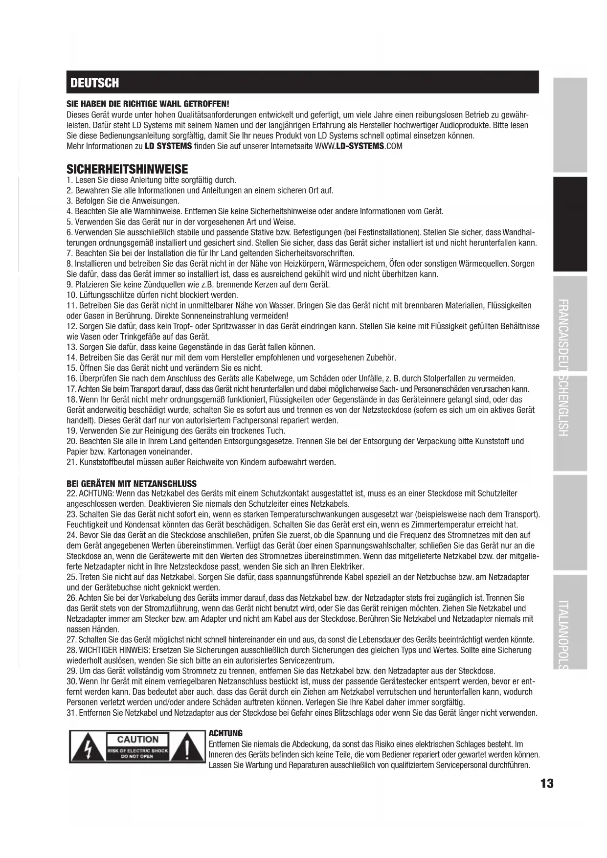 DEUTSCH SIE HABEN DIE RICHTIGE WAHL GETROFFEN! Dieses Gerät wurde unter hohen Qualitätsanforderungen entwickelt und gefertigt, um viele Jahre einen reibungslosen Betrieb zu gewähr- leisten. Dafür steht LD Systems mit seinem Namen und der langjährigen Erfahrung als Hersteller hochwertiger Audioprodukte. Bitte lesen Sie diese Bedienungsanleitung sorgfältig, damit Sie Ihr neues Produkt von LD Systems schnell optimal einsetzen können. Mehr Informationen zu LD SYSTEMS finden Sie auf unserer Internetseite WWW.LD-SYSTEMS.COM SICHERHEITSHINWEISE