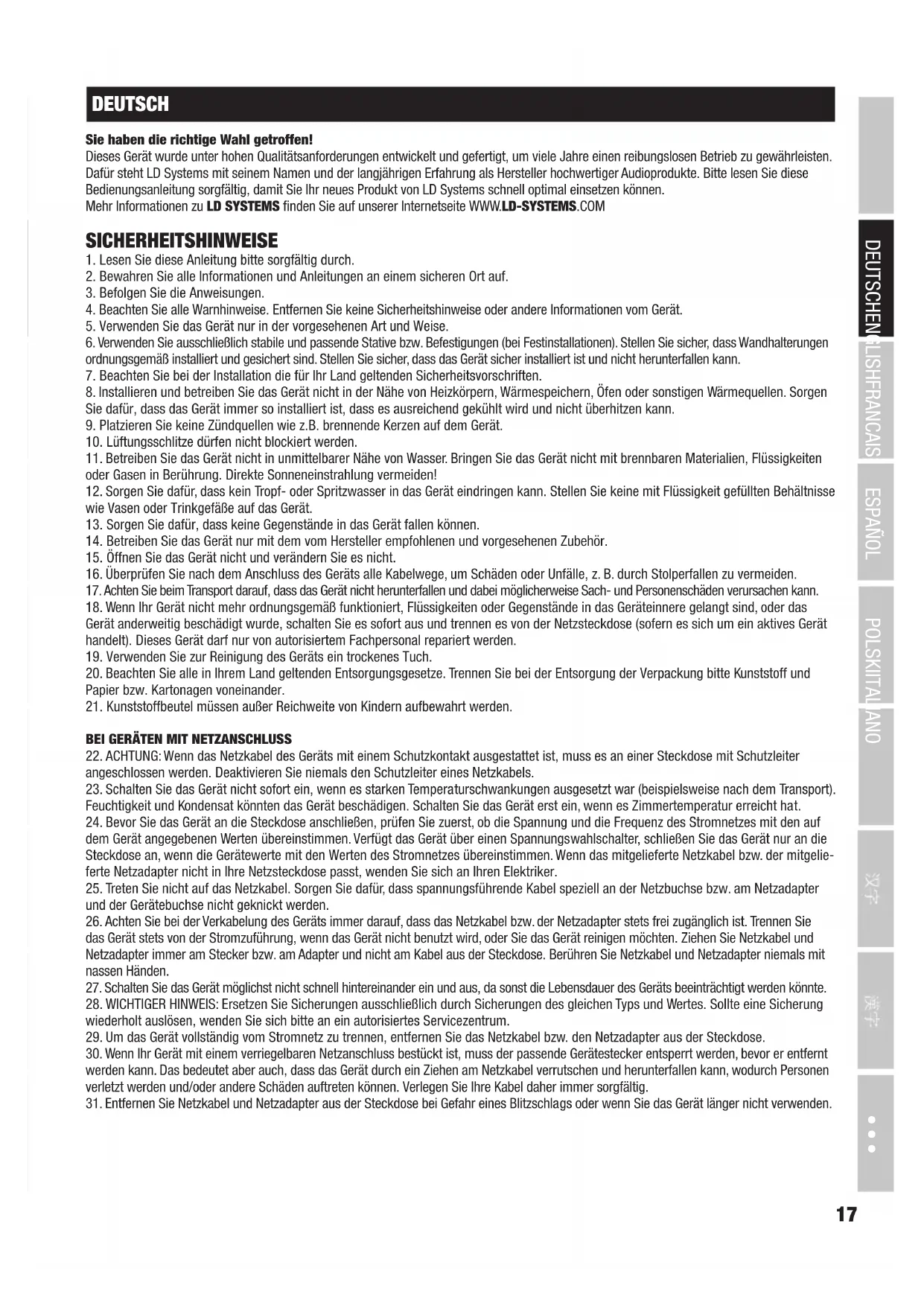 DEUTSCH Sie haben die richtige Wahl getroffen! Dieses Gerät wurde unter hohen Qualitätsanforderungen entwickelt und gefertigt, um viele Jahre einen reibungslosen Betrieb zu gewährleisten. Dafür steht LD Systems mit seinem Namen und der langjährigen Erfahrung als Hersteller hochwertiger Audioprodukte. Bitte lesen Sie diese Bedienungsanleitung sorgfältig, damit Sie Ihr neues Produkt von LD Systems schnell optimal einsetzen können. Mehr Informationen zu LD SYSTEMS finden Sie auf unserer Internetseite WWW.LD-SYSTEMS.COM SICHERHEITSHINWEISE