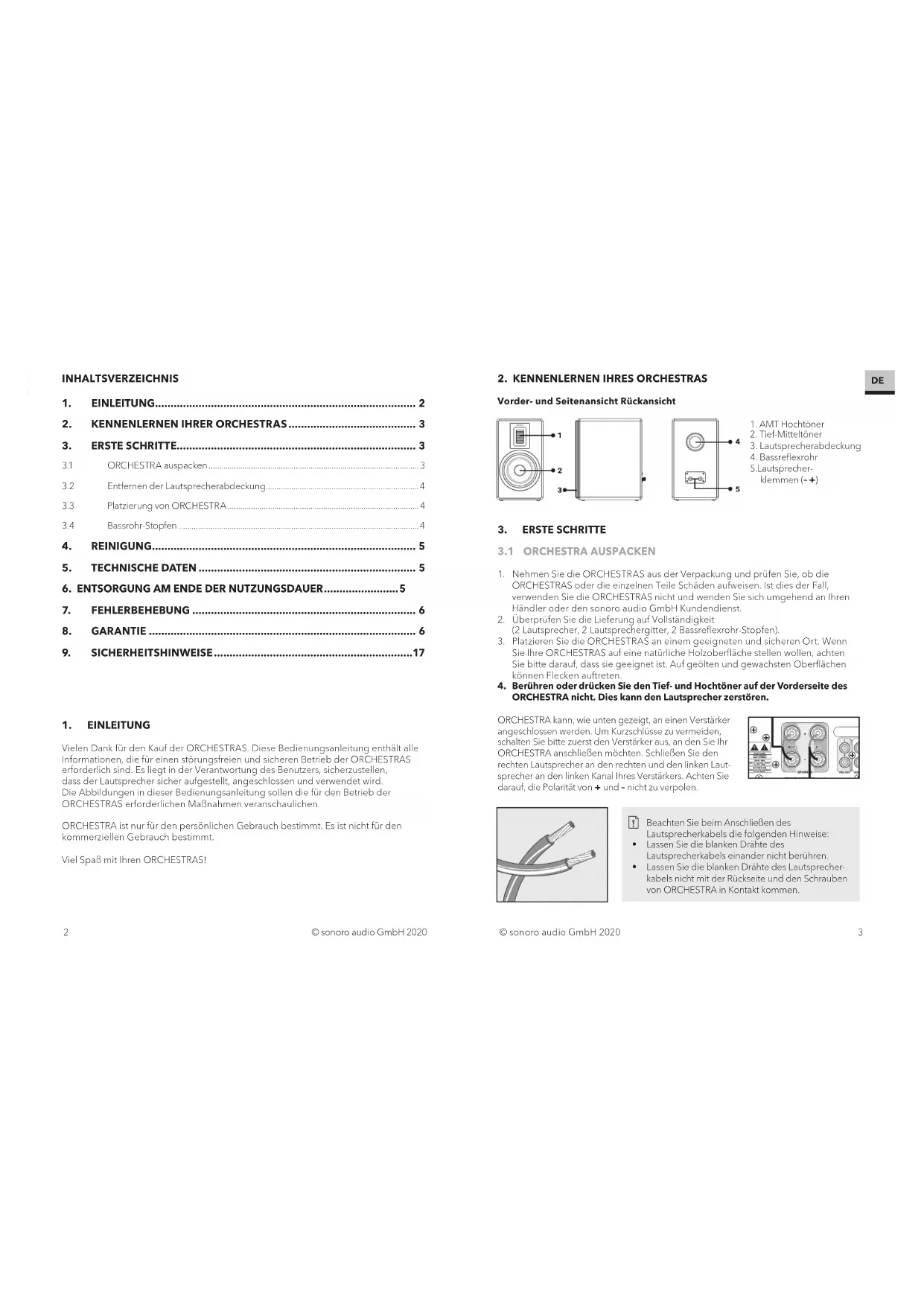 - Lassen Sie die blanken Drähte des Lautsprecher- kabels nicht mit der Rückseite und den Schrauben von ORCHESTRA in Kontakt kommen. © sonoro audio GmbH 2020 3© sonoro audio GmbH 20202