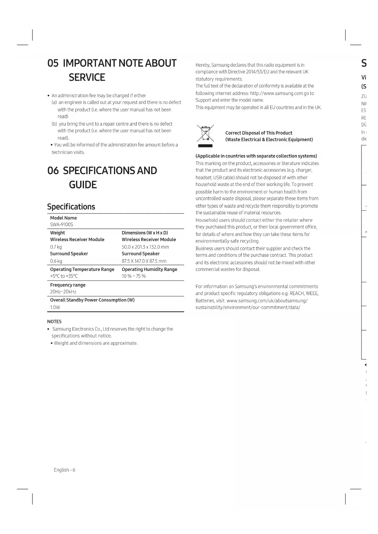 - Die Höhe dieser Gebühr wird Ihnen mitgeteilt, bevor irgendwelche Arbeiten durchgeführt werden oder der Hausbesuch erfolgt. 06 SPEZIFIKATIONEN UND LEITFADEN Technische daten Modellname SWA-9100S Gewicht Drahtloses Empfängermodul 0,7 kg Surroundlautsprecher 0,6 kg Abmessungen (B × H × T) Drahtloses Empfängermodul 50,0 x 201,3 x 132,0 mm Surroundlautsprecher 87,5 X 147,0 X 87,5 mm Betriebstemperatur +5°C bis +35°C Zulässige Luftfeuchtigkeit 10 % bis 75 % Frequenzbereich 20 Hz bis 20 kHz Gesamtstromverbrauch im Bereitschaftszustand (W) 1,0W HINWEISE