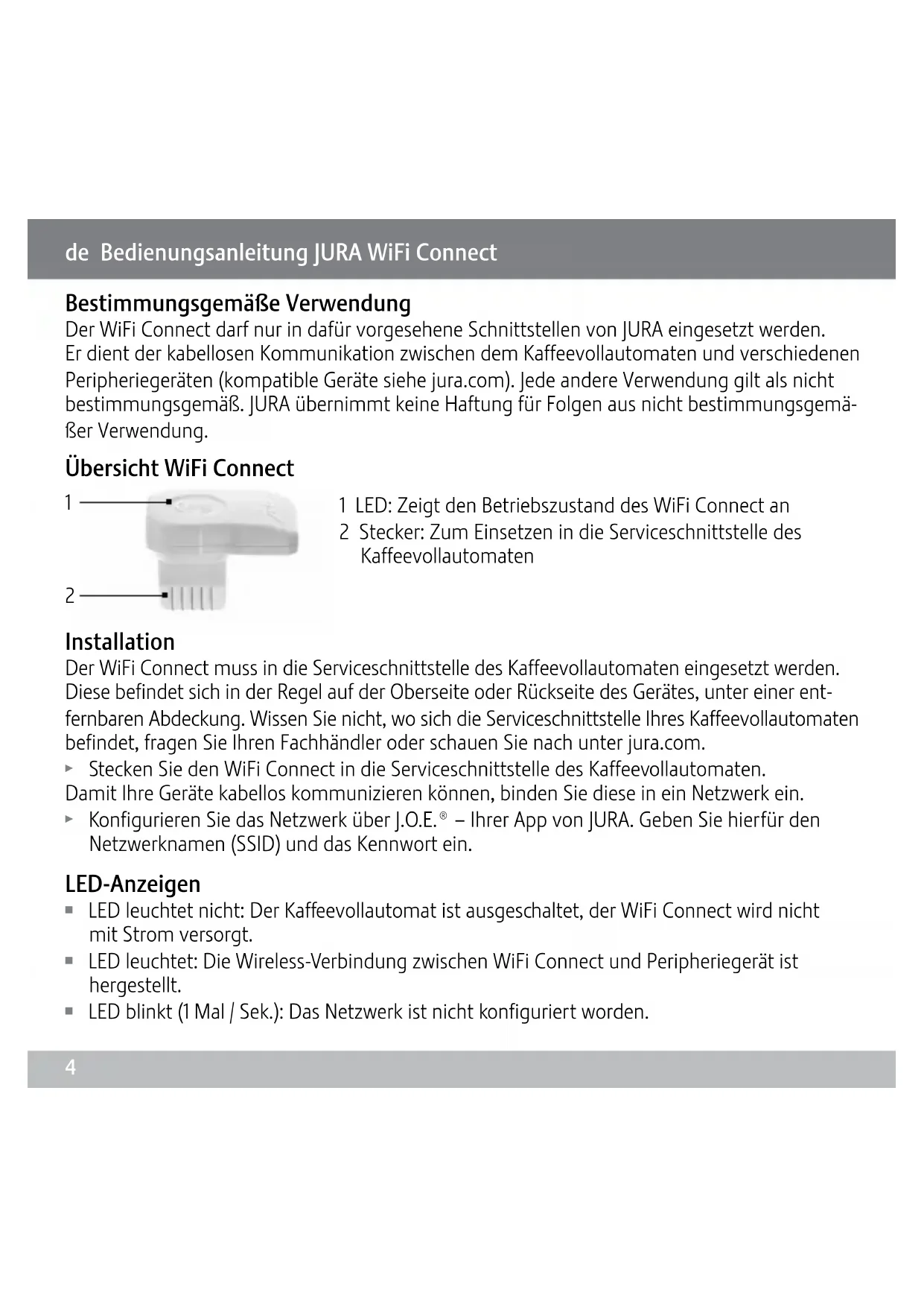 Langaton yhteys (Bluetooth/WiFi): Taajuuskaista 2,4 GHz | Suurin lähetysteho < 1 mW4 Bestimmungsgemäße Verwendung Der WiFi Connect darf nur in dafür vorgesehene Schnittstellen von JURA eingesetzt werden. Er dient der kabellosen Kommunikation zwischen dem Kaffeevollautomaten und verschiedenen Peripheriegeräten (kompatible Geräte siehe jura.com). Jede andere Verwendung gilt als nicht bestimmungsgemäß. JURA übernimmt keine Haftung für Folgen aus nicht bestimmungsgemä- ßer Verwendung. Übersicht WiFi Connect 1 LED: Zeigt den Betriebszustand des WiFi Connect an 2 Stecker: Zum Einsetzen in die Serviceschnittstelle des Kaffeevollautomaten de Bedienungsanleitung JURA WiFi Connect Installation Der WiFi Connect muss in die Serviceschnittstelle des Kaffeevollautomaten eingesetzt werden. Diese befindet sich in der Regel auf der Oberseite oder Rückseite des Gerätes, unter einer ent- fernbaren Abdeckung. Wissen Sie nicht, wo sich die Serviceschnittstelle Ihres Kaffeevollautomaten befindet, fragen Sie Ihren Fachhändler oder schauen Sie nach unter jura.com. T Stecken Sie den WiFi Connect in die Serviceschnittstelle des Kaffeevollautomaten. Damit Ihre Geräte kabellos kommunizieren können, binden Sie diese in ein Netzwerk ein. T Konfigurieren Sie das Netzwerk über J.O.E.® – Ihrer App von JURA. Geben Sie hierfür den Netzwerknamen (SSID) und das Kennwort ein. LED-Anzeigen Z LED leuchtet nicht: Der Kaffeevollautomat ist ausgeschaltet, der WiFi Connect wird nicht mit Strom versorgt. Z LED leuchtet: Die Wireless-Verbindung zwischen WiFi Connect und Peripheriegerät ist hergestellt. Z LED blinkt (1 Mal / Sek.): Das Netzwerk ist nicht konfiguriert worden.