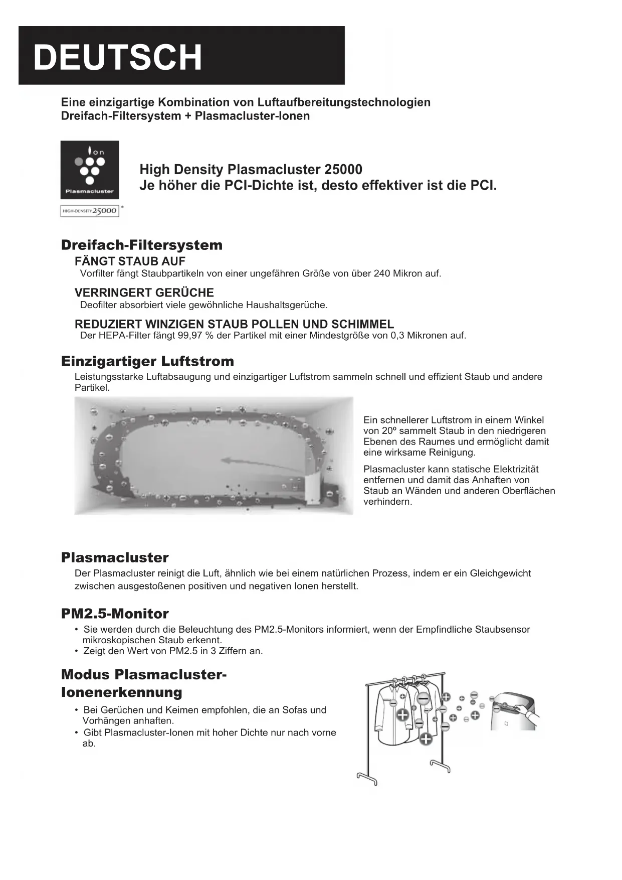 MEMODEUTSCH Eine einzigartige Kombination von Luftaufbereitungstechnologien Dreifach-Filtersystem + Plasmacluster-Ionen High Density Plasmacluster 25000 Je höher die PCI-Dichte ist, desto effektiver ist die PCI. Dreifach-Filtersystem