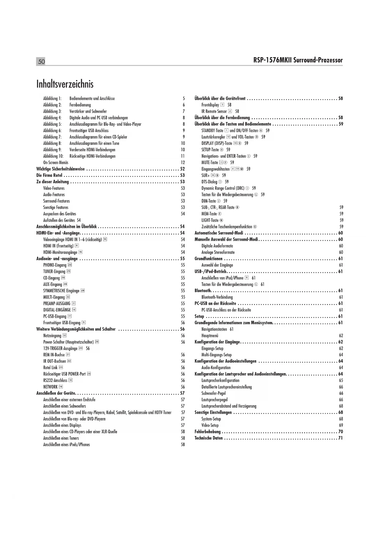 - Vériez que le jeu de codes infrarouge de la télécommande et du RSP-1576 soient les mêmes, soit le jeu de codes 1, ou le jeu de codes2. L’utilisation du badge Made for Apple signie qu’un accessoire a été conçu pour se connecter spéciquement au (x) produit (s) Apple identié (s) sur le badge et a été certié par le développeur pour répondre aux normes de performance Apple. Apple n’est pas responsable du fonctionnement de cet appareil ni de sa conformité aux normes de sécurité et réglementaires. Apple, Apple TV, Apple Watch, iPad, iPad Air, iPad Pro, iPhone et Lightning sont des marques d’Apple Inc., déposées aux États-Unis et dans d’autres pays. tvOS est une marque déposée d’Apple Inc. Spécications Audio Distortion Harmonique Totale <0,0006 % (Analogique) <0,003 % (Entrée numérique)Distorsion d’intermodulation < 0,005 %Réponse en fréquence Niveau Phono 20 Hz – 20 kHz, ± 0,5 dB Analogique 10 Hz – 100 kHz, ± 1 dB Entrée numérique 20 Hz – 20 kHz, ± 0,5 dBRapport S/B (pondéré A) Analogique 112 dB Entrée numérique 112 dBSensibilité d’entrée/Impédance Niveau Phono 3.5 mV /47 kOhms Niveau Ligne 270 mV/100 kOhms Niveau Symétrique 500 mV/100 kOhmsNiveau de sortie préampli Niveau Ligne 1,0 V Séparation des canaux (à 10 kHz) >75 dBAudio Numérique LPCM (jusqu’à 24 bits, 192 kHz) Dolby Surround Dolby TrueHD Dolby ATMOS DTS-HD Master Audio DTS X Vidéo Résolutions d’entrée 480i/576i, 480p/576p, 720p, 1080i, 1080p, 1080p 24Hz, 3D, 4K, UHD, 4K 60Hz, 4K HDR10Résolutions de sortie 480i/576i, 480p/576p, 720p 1080i, 1080p, 1080p 24Hz, 3D, 4K, UHD, 4K 60Hz, 4K HDR10Comptabilité Espaces Couleur sRGB, YCbCr 4:2:2, YCbCr 4:4:4Compatibilité Deep Color 24 bits, 30 bits, 36 bitsEntrées/sorties HDMI 7 entrées compatibles HDCP 2.2, HDMI2.0a 2 sorties compatibles HDCP 2.2, HDMI2.0a Canal de retour audio (ARC) Généralités Consommation électrique 60 watts, veille Standby 0,5 wattAlimentation 120 volts, 60 Hz (version U.S.) 230 volts, 50 Hz (version CE)BTU 114 BTU/hDimensions 431 x 144 x 348 mm 17 x 5 /3 x 13 /7 poucesHauteur face avant 3U / 132.6 mm / 5 /4 poucesPoids (net) 8.8 kg / 19.4 livresToutes ces spécifications sont garanties exactes au moment de l’impression. Rotel se réserve le droit de les modifier sans préavis dans le but d’améliorer encore la qualité de l’appareil.Rotel et le logo Rotel Hifi sont des marques déposées de The Rotel Co, Ltd, Tokyo, Japon.50 RSP-1576MKII Surround-Prozessor Überblick über die Gerätefront ........................................58 Frontdisplay 3 58 IR Remote Sensor 2 58 Überblick über die Fernbedienung ......................................58 Überblick über die Tasten und Bedienelemente .............................59 STANDBY-Taste 1 und ON/OFF-Tasten A 59 Lautstärkeregler = und VOL-Tasten D 59 DISPLAY (DISP)-Taste 0B 59 SETUP-Taste H 59 Navigations- und ENTER-Tasten I 59 MUTE-Taste -F 59 Eingangswahltasten 4qM 59 SUR+ 9B 59 DTS-Dialog I 59 Dynamic Range Control (DRC) I 59 Tasten für die Wiedergabesteuerung L 59 DIM-Taste J 59 SUB-, CTR-, REAR-Taste B 59 MEM-Taste E 59 LIGHT-Taste N 59 Zusätzliche Taschenlampenfunktion O 59 Automatische Surround-Modi .........................................60 Manuelle Auswahl der Surround-Modi ...................................60 Digitale Audioformate 60 Analoge Stereoformate 60 Grundfunktionen ..................................................61 Auswahl der Eingänge 61 USB-/iPod-Betrieb .................................................61 Anschließen von iPod/iPhone 5 61 Tasten für die Wiedergabesteuerung L 61 Bluetooth. . . . . . . . . . . . . . . . . . . . . . . . . . . . . . . . . . . . . . . . . . . . . . . . . . . . . . . . 61 Bluetooth-Verbindung 61 PC-USB an der Rückseite ............................................61 PC-USB-Anschluss an der Rückseite 61 Setup ..........................................................61 Grundlegende Informationen zum Menüsystem. . . . . . . . . . . . . . . . . . . . . . . . . . . . . 61 Navigationstasten 61 Hauptmenü 62 Konguration der Eingänge ...........................................62 Eingangs-Setup 62 Multi-Eingangs-Setup 64 Konguration der Audioeinstellungen ...................................64 Audio-Konguration 64 Konguration der Lautsprecher und Audioeinstellungen .......................64 Lautsprecherkonguration 65 Detaillierte Lautsprechereinstellung 66 Subwoofer-Pegel 66 Lautsprecherpegel 66 Lautsprecherabstand und Verzögerung 68 Sonstige Einstellungen ..............................................68 System-Setup 68 Video-Setup 69 Fehlerbehebung ...................................................70 Technische Daten ..................................................71 Inhaltsverzeichnis Abbildung 1: Bedienelemente und Anschlüsse 5 Abbildung 2: Fernbedienung 6 Abbildung 3: Verstärker und Subwoofer 7 Abbildung 4: Digitale Audio und PC-USB verbindungen 8 Abbildung 5: Anschlussdiagramm für Blu-Ray- und Video-Player 8 Abbildung 6: Frontseitiger USB-Anschluss 9 Abbildung 7: Anschlussdiagramm für einen CD-Spieler 9 Abbildung 8: Anschlussdiagramm für einen Tune 10 Abbildung 9: Vorderseite HDMI-Verbindungen 10 Abbildung 10: Rückseitige HDMI-Verbindungen 11 On-Screen-Menüs 12 Wichtige Sicherheitshinweise .........................................52 Die Firma Rotel ...................................................53 Zu dieser Anleitung ................................................53 Video-Features 53 Audio-Features 53 Surround-Features 53 Sonstige Features 53 Auspacken des Gerätes 54 Aufstellen des Gerätes 54 Anschlussmöglichkeiten im Überblick ....................................54 HDMI-Ein- und -Ausgänge ............................................54 Videoeingänge HDMI IN 1–6 (rückseitig) r 54 HDMI IN (frontseitig) 6 54 HDMI-Monitorausgänge e 54 Audioein- und -ausgänge ............................................55 PHONO-Eingang f 55 TUNER-Eingang f 55 CD-Eingang f 55
